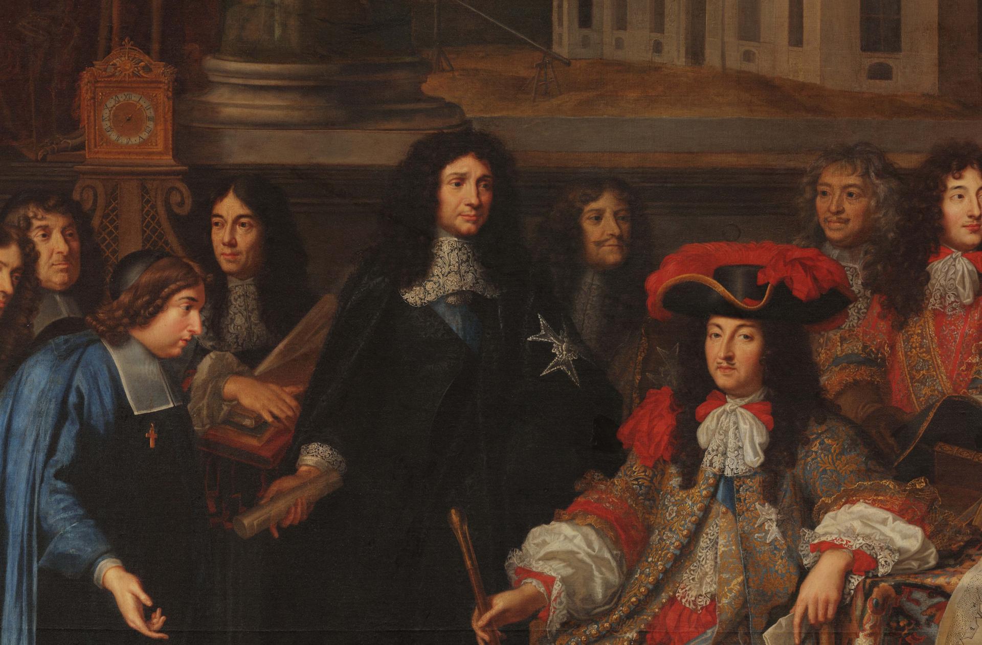 Louis XIV est au premier plan à droite. À la gauche du monarque, en noir, se trouve Jean-Baptiste Colbert et derrière lui, Charles Perrault est figuré portant des manuscrits.