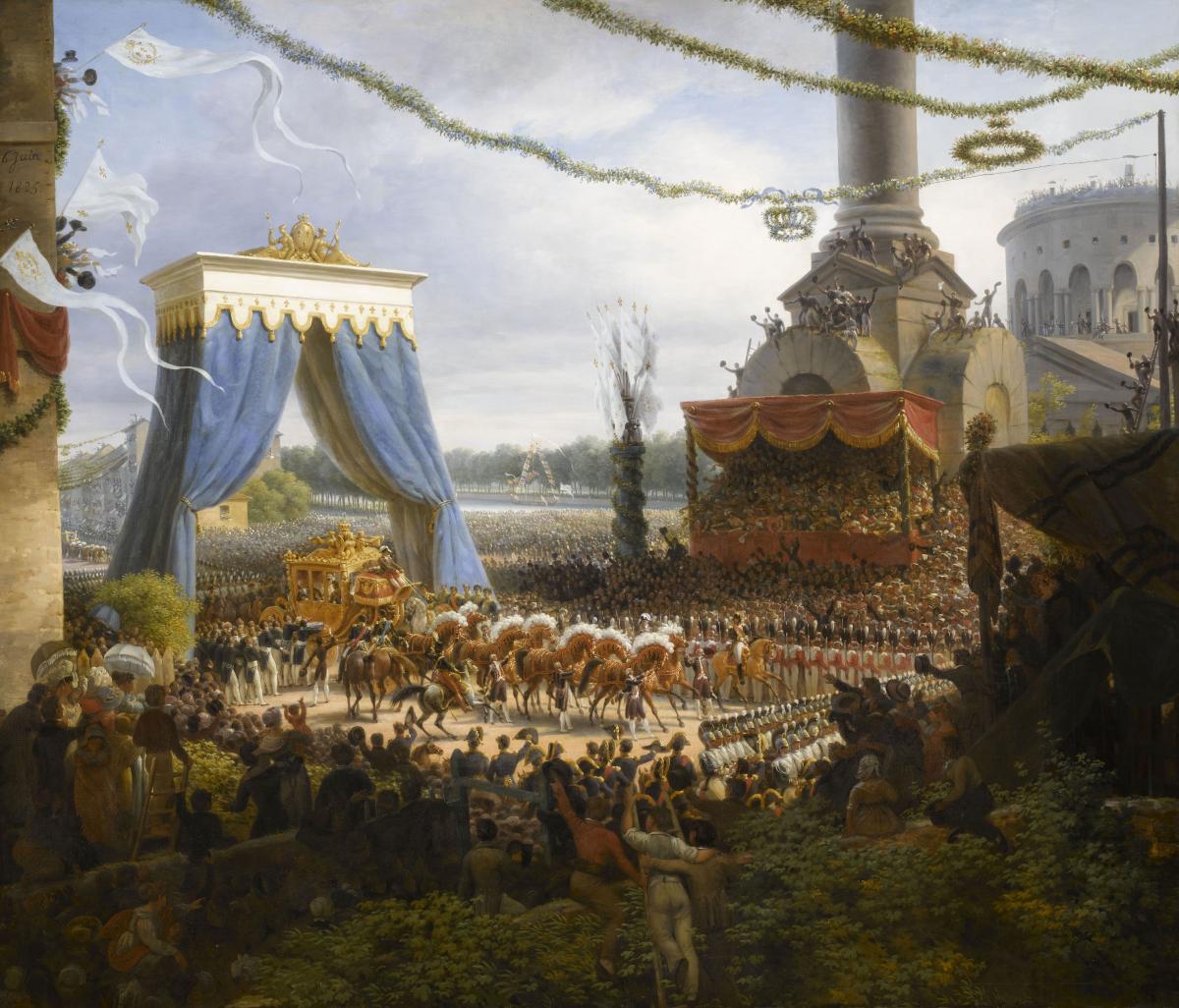 Cette cérémonie du sacre, grandiose mais d’un autre temps, cinquante ans après le sacre de Louis XVI, surprit une bonne partie de l’opinion et témoignait d’un retour en arrière qu’elle ne pouvait accepter. Charles X fut renversé par la révolution de juillet 1830, les « Trois Glorieuses », et partit pour un exil qui le mena en Angleterre, en Ecosse, à Prague et finalement en Istrie, où il mourut en 1836.
