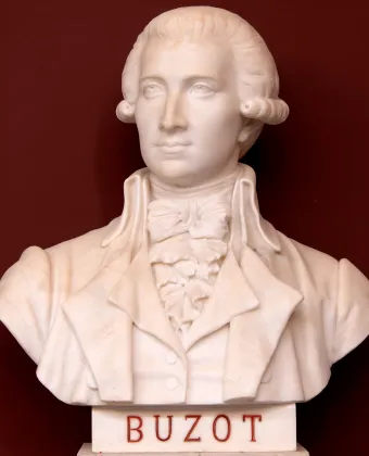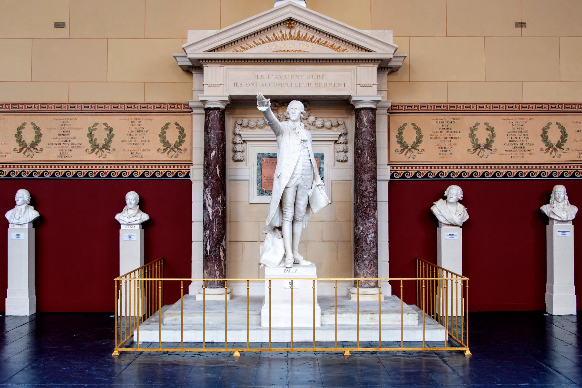 L’édicule situé derrière la statue de Bailly, ici représenté prêtant serment devant l’Assemblée, a été érigé en 1880 sous la direction de l’architecte Edmond Guillaume (1826-1894), alors en charge de la restauration du bâtiment.