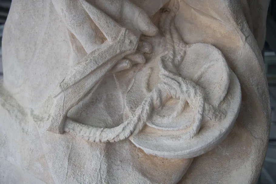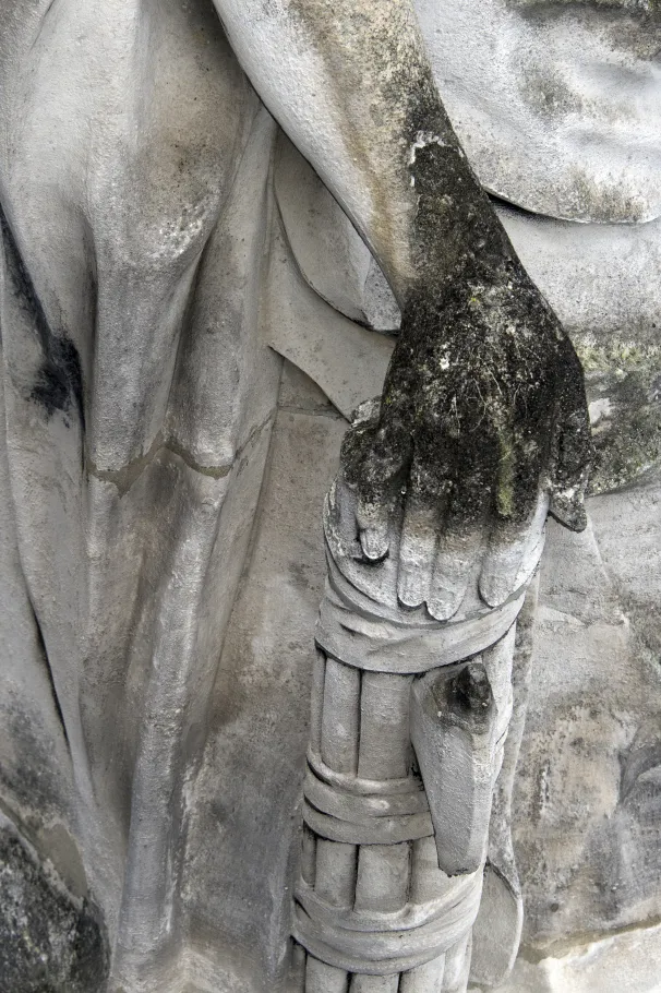Figure féminine aux cheveux ondulés, la Justice est revêtue d’une robe et d’un manteau tenu sur la poitrine par deux fibules rondes. Le bras droit prenant appui sur un faisceau de licteur, elle tient de la main gauche les plateaux d’une balance.