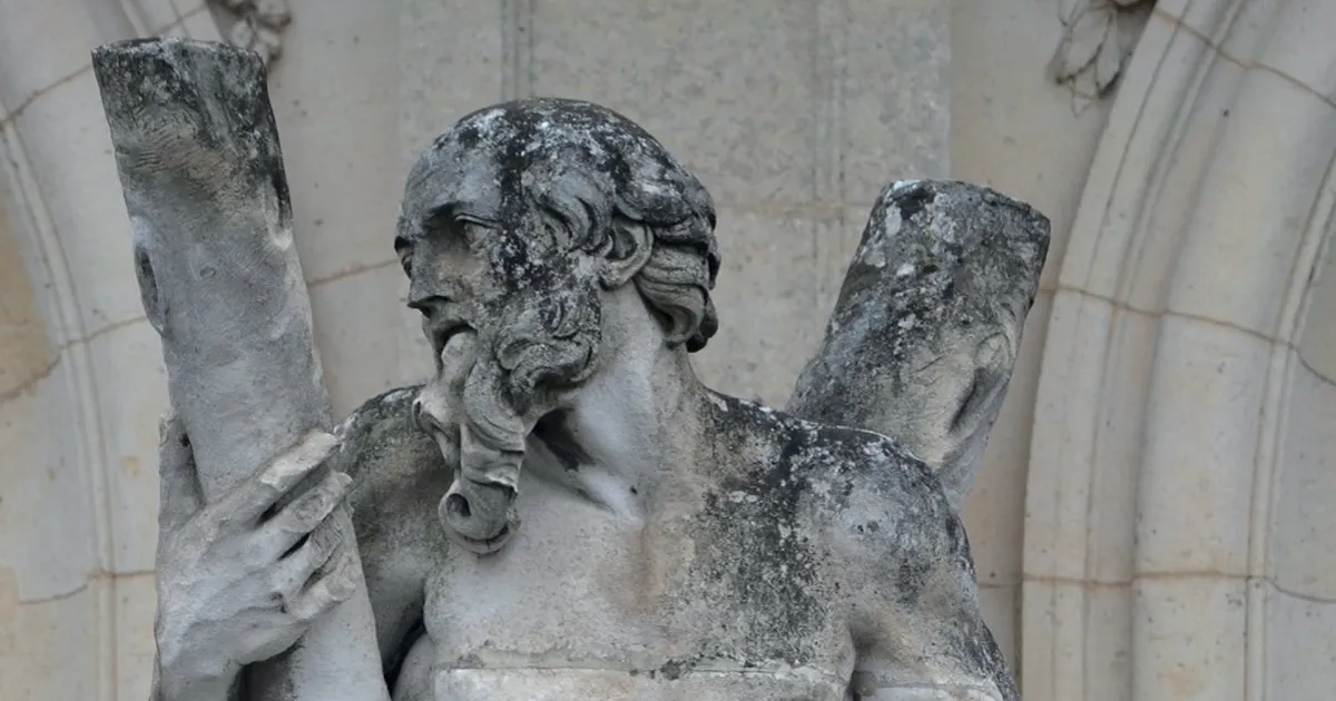 L’apôtre saint André est figuré en homme d’âge mûr, dont le corps nu n’est recouvert que par un drapé au niveau du bassin. Encadré par une longue barbe et des cheveux courts, le visage est tourné vers la croix en X sur laquelle s’appuie le saint. Pêcheur sur le lac de Tibériade, comme son frère cadet saint Pierre, saint André est le premier apôtre à suivre Jésus. La légende dorée de Jacques de Voragine lui prête après la Pentecôte un apostolat légendaire en Asie Mineure, le long des côtes de la Mer Noire et enfin en Grèce, où il fut crucifié sur ordre des autorités romaines. Particulièrement vénéré par l’Église Orthodoxe, il est également le saint patron de l’Écosse.