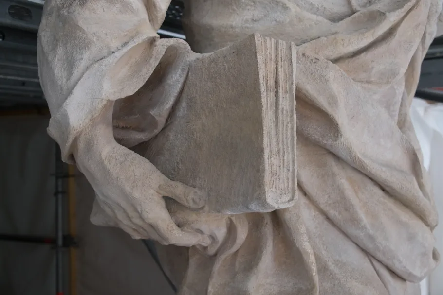 Saint Jacques le Majeur est représenté en homme d’âge mûr, portant cheveux longs et barbe courte. Vêtu d’une tunique et d’un long manteau, il retient un livre fermé dans sa main droite et s’appuie sur un bourdon de pèlerin avec sa main gauche.