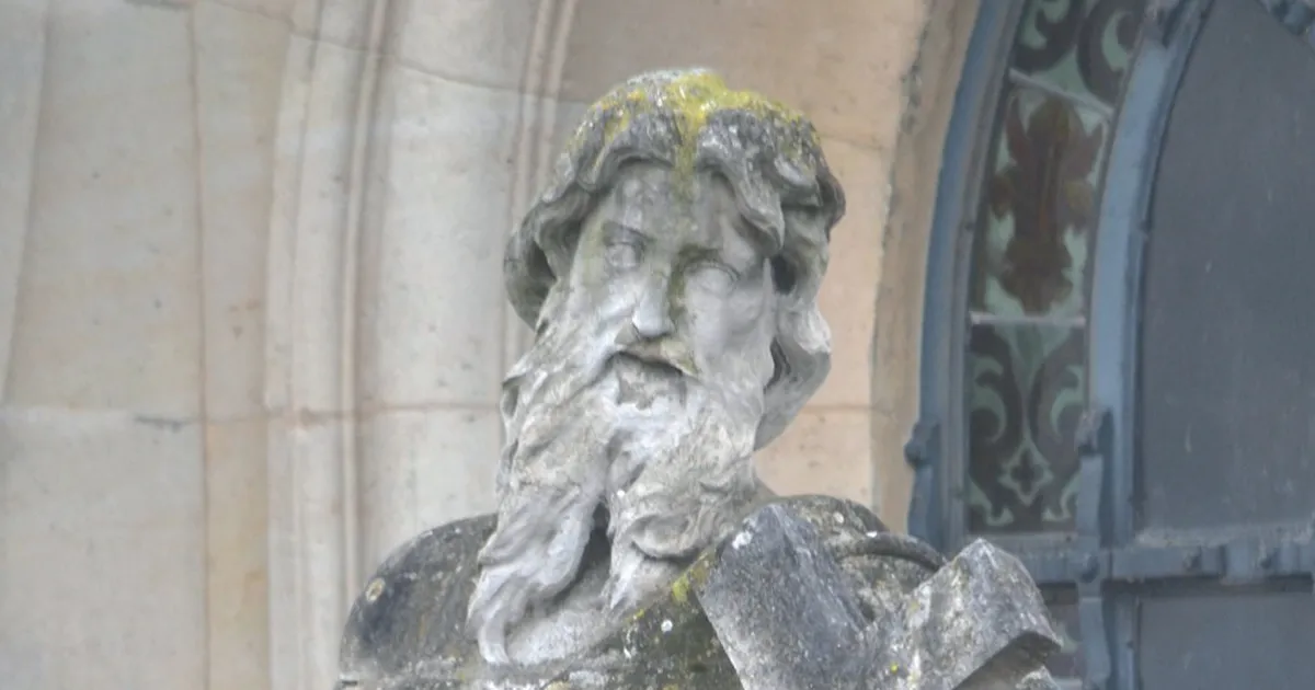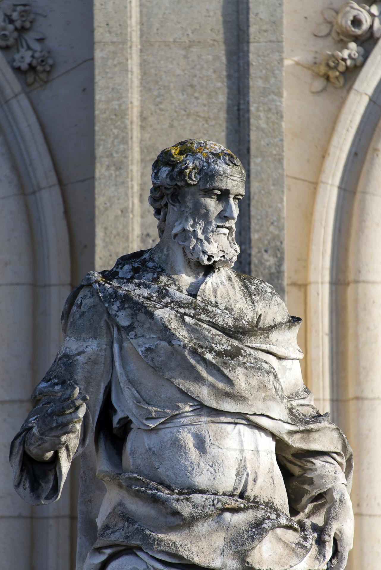 Cheveux longs, barbes et moustache, l’apôtre saint Philippe est vêtu d’une tunique à manches longues recouverte d’un manteau. Il tient dans les bras une croix, symbole de son martyre.