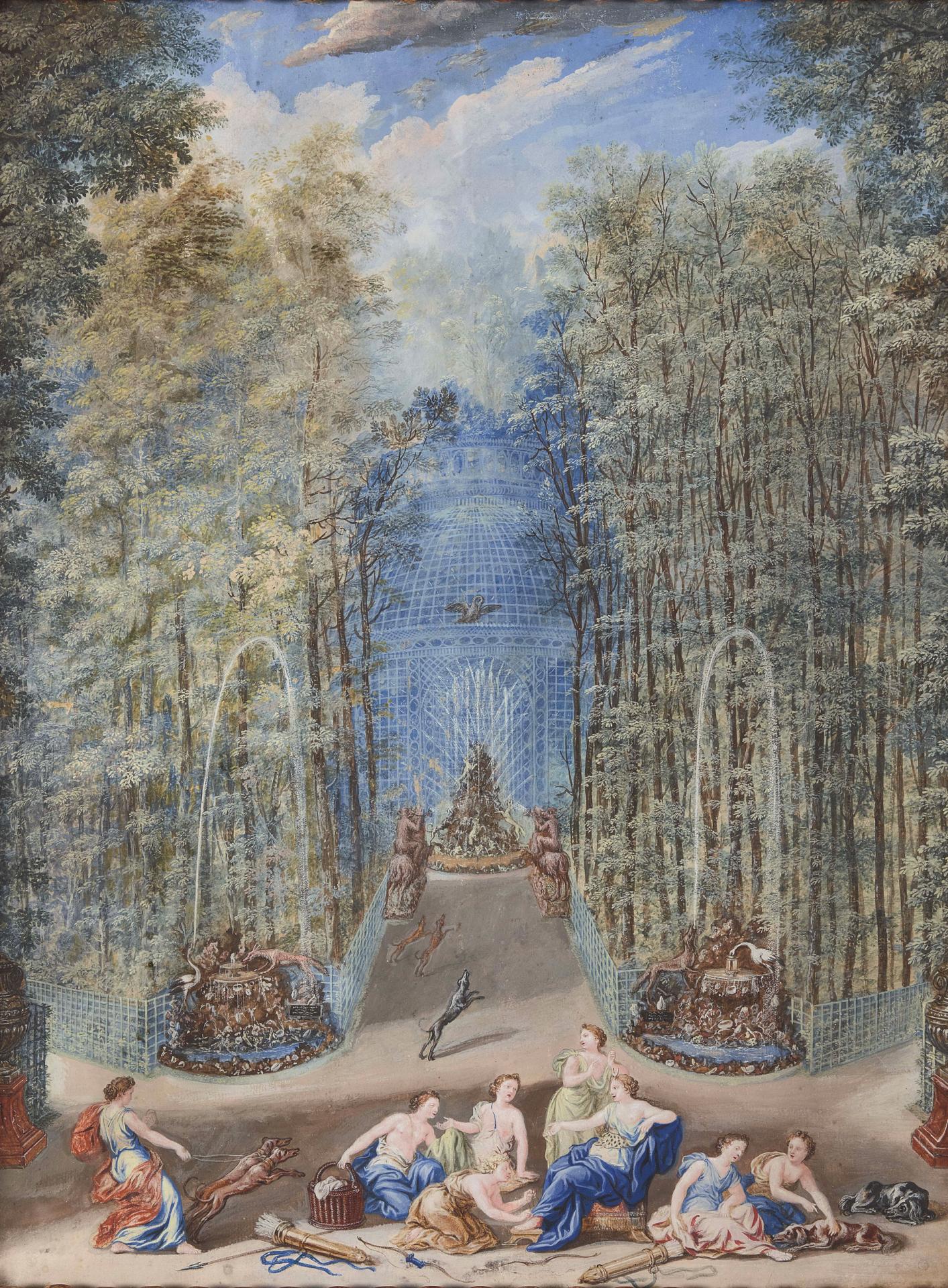Vue de l’entrée du bosquet du Labyrinthe avec des nymphes et des amours prenant des oiseaux dans leurs filets, par Jean Cotelle