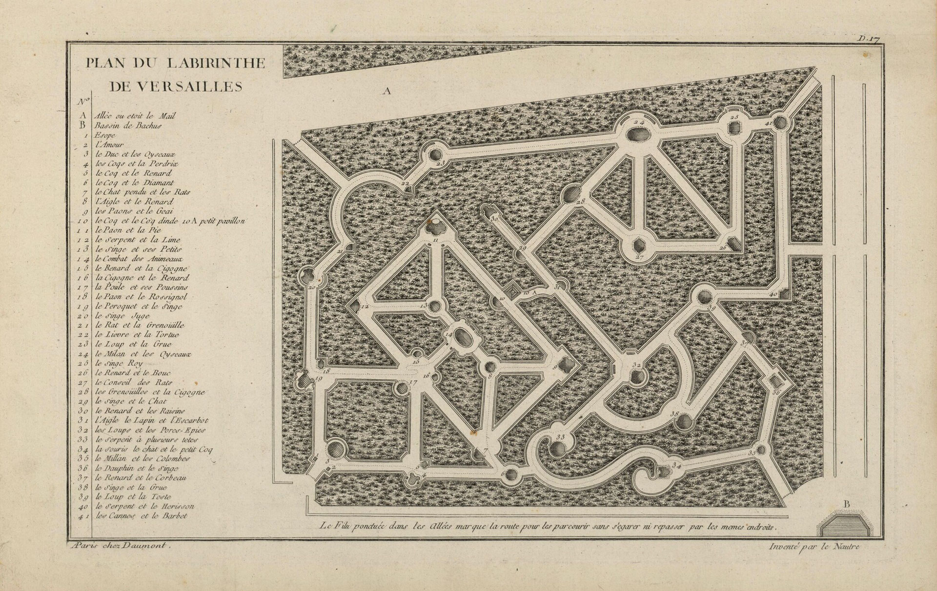 Le bosquet du Labyrinthe, construit par André Le Nôtre sur ordre de Louis XIV, est d'abord un bosquet purement végétal. De nombreuses fontaines sont ajoutées dès 1673, contant les fables d’Ésope. Le bosquet est finalement détruit sous le règne de Louis XVI, pour laisser place au bosquet de la Reine. Aujourd’hui encore le souvenir de ce labyrinthe persiste comme étant l’un des plus myhtiques endroits disparus de Versailles, en raison notamment des nombreuses sculptures en plomb animées de jets d’eau et représentant des animaux.