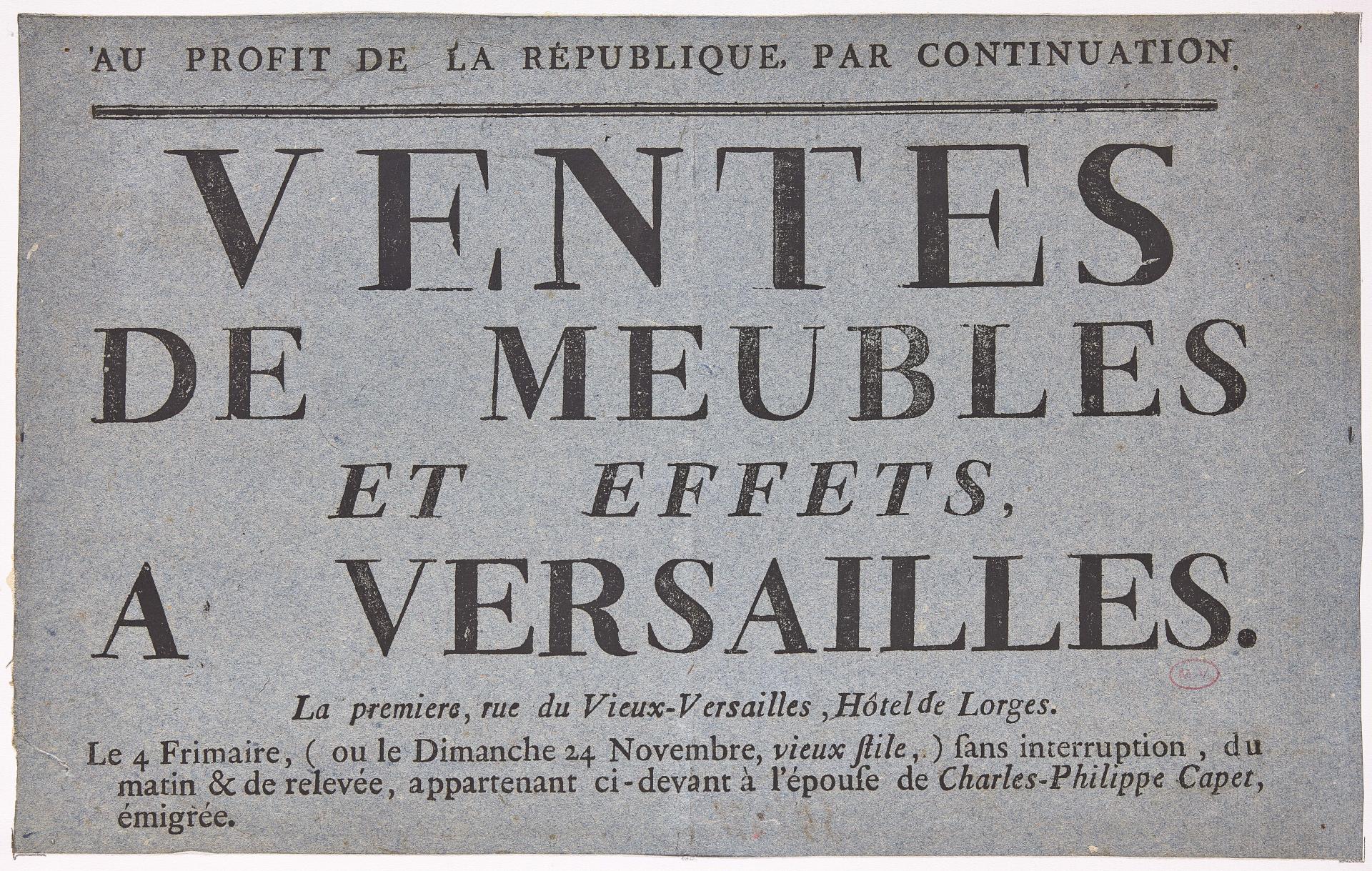 Affiche révolutionnaire : ventes de meubles et effets à Versailles