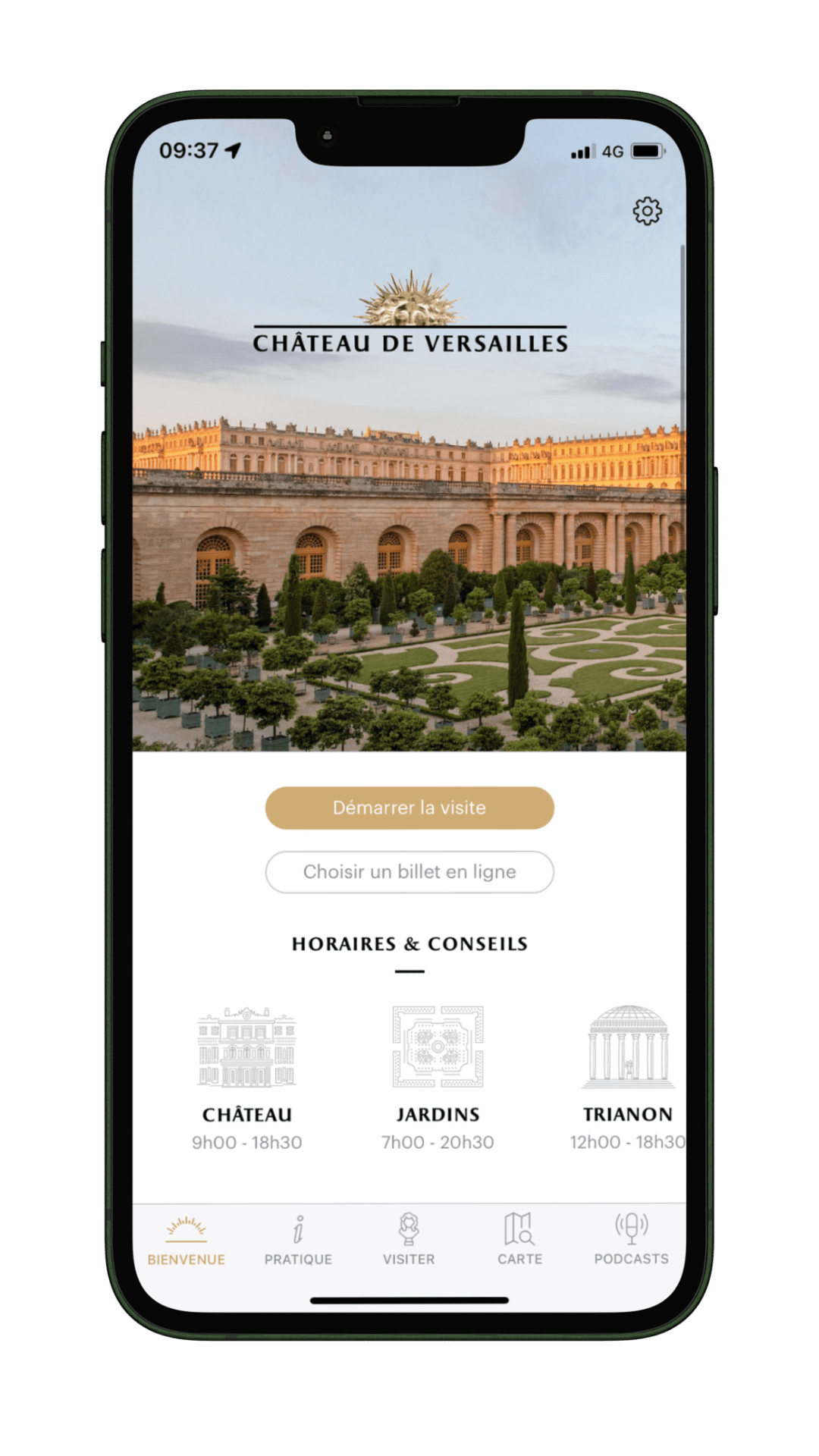 - d'écouter tous les parcours audio (Château, Jardins, domaine de Trianon, galerie des Carrosses),