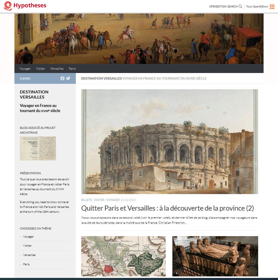 Le blog grand public raconte à travers des billes thématiques comment se déroulaient les voyages et les visites à Versailles et aux environs (Saint-Cloud, les Invalides, etc.) à la fin du XVIIe siècle.