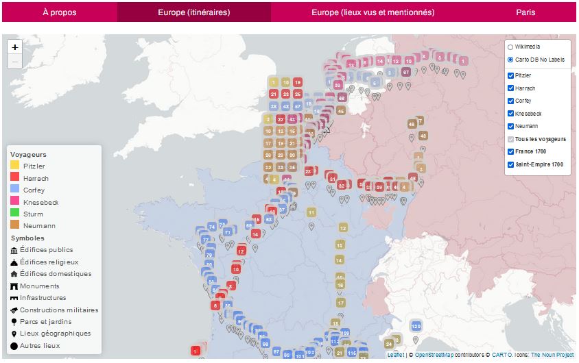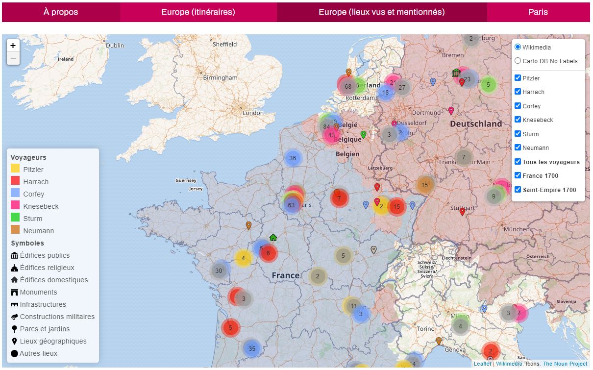 Les trois cartes offrent un point d’entrée complémentaire dans les écrits des six voyageurs : Christoph Pitzler, Ferdinand Bonaventure comte de Harrach, Lambert Friedrich Corfey, Christian Friedrich Gottlieb von dem Knesebeck, Leonhard Christoph Sturm et Balthasar Neumann. Elles sont interactives sur fond de cartes contemporaines et apportent des informations détaillées sur les lieux grâce aux entrées d’index :