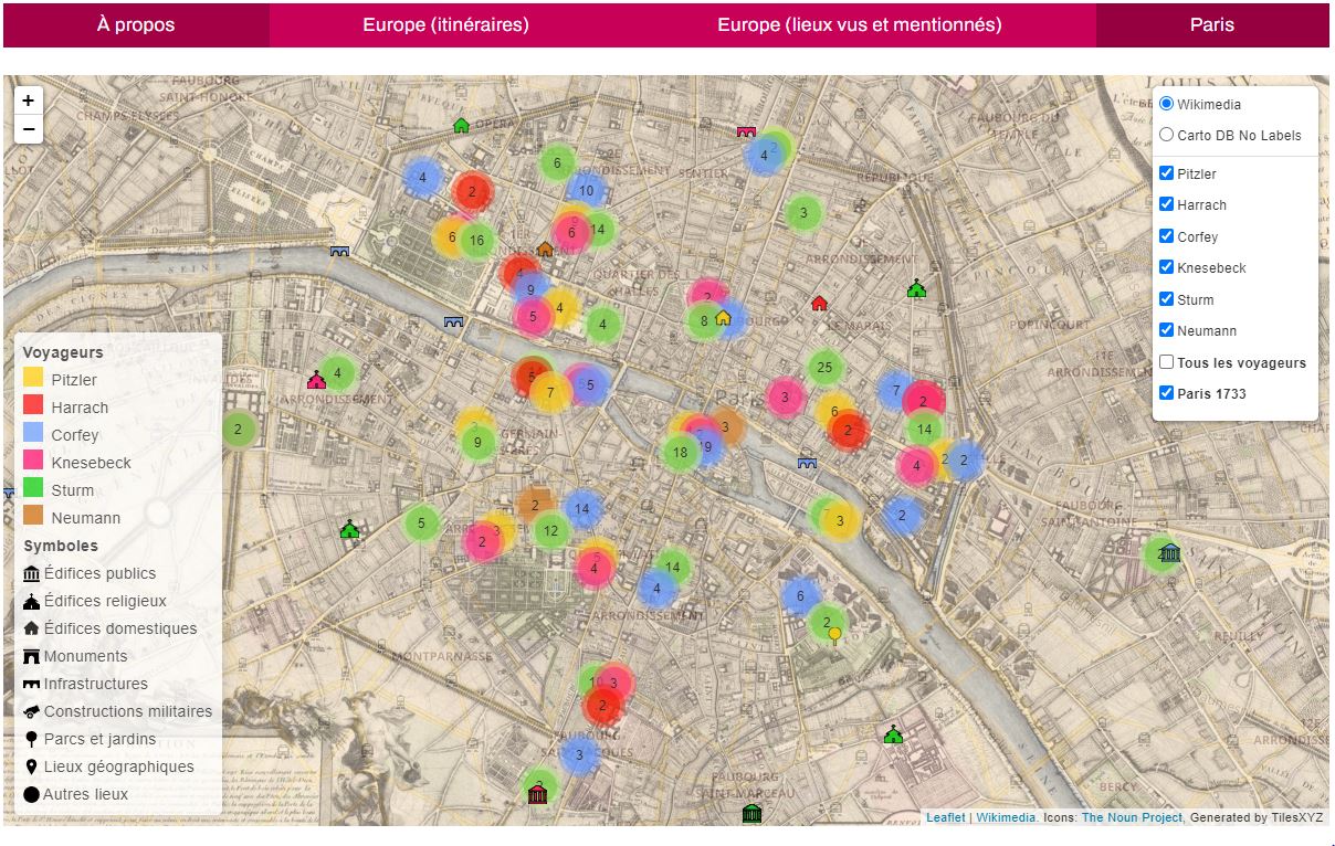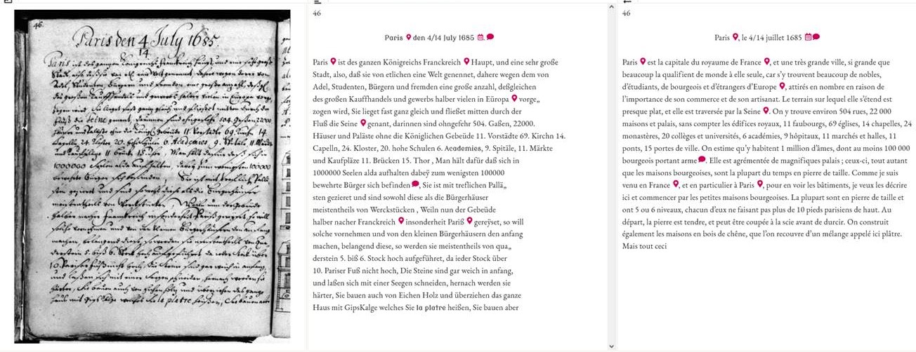 Dirigé par le professeur Hendrik Ziegler, ce projet de recherche met à disposition de nombreux documents sur son site d'édition numérique. Vous pourrez y découvrir les fac-similés, transcriptions et traductions de cinq manuscrits et d’un imprimé de voyageurs allemands, rédigés entre 1685 et 1723, accompagnés de notes scientifiques, ainsi que les index des lieux, œuvres d’art et personnes cités dans les textes, ou encore les textes de présentation des sources, le tout à la fois en français et en allemand. À ces précieuses ressources s’ajoutent le blog "Destination Versailles : voyager en France au tournant du XVIIIe siècle", et trois cartes interactives retraçant leurs itinéraires et les villes et bâtiments visités et commentés en Europe, en France et à Paris et Versailles.