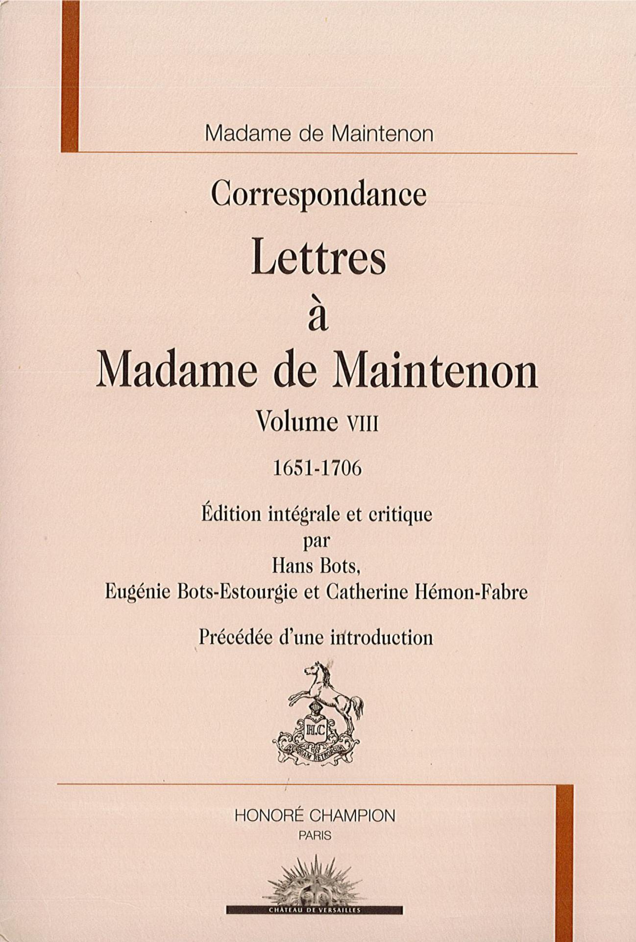 Le présent volume VIII est le premier des quatre volumes de la correspondance passive de Mme de Maintenon ; il fait suite aux sept volumes des Lettres de Madame de Maintenon déjà publiés. On y trouvera 597 lettres adressées à la Marquise par 80 correspondants différents entre 1651 et la fin de juin 1706. Les principaux correspondants sont l'évêque de Chartres, Paul Godet des Marais, et Fénelon, parmi le haut clergé, le duc du Maine, Monseigneur, la reine d'Espagne et la princesse des Ursins parmi la famille royale et la haute aristocratie.