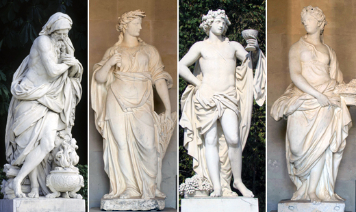 Les statues de marbre photographiées ci-dessus, qui ornent les Jardins de Versailles, font toutes parties de la Grande Commande de 1674. Chacune représente une saison, saurez-vous les identifier ?