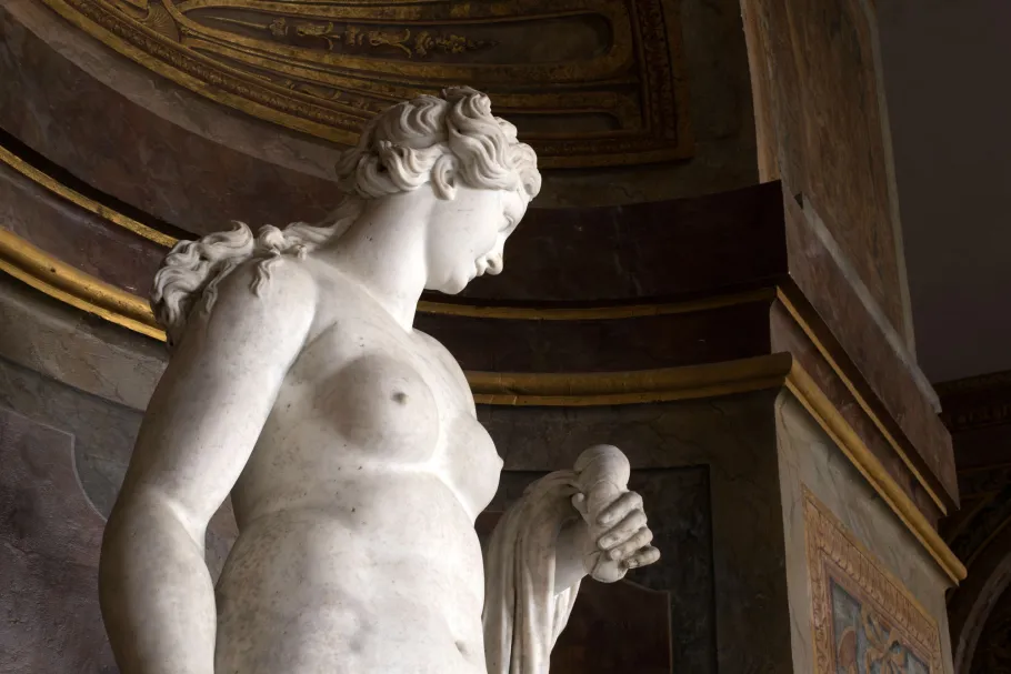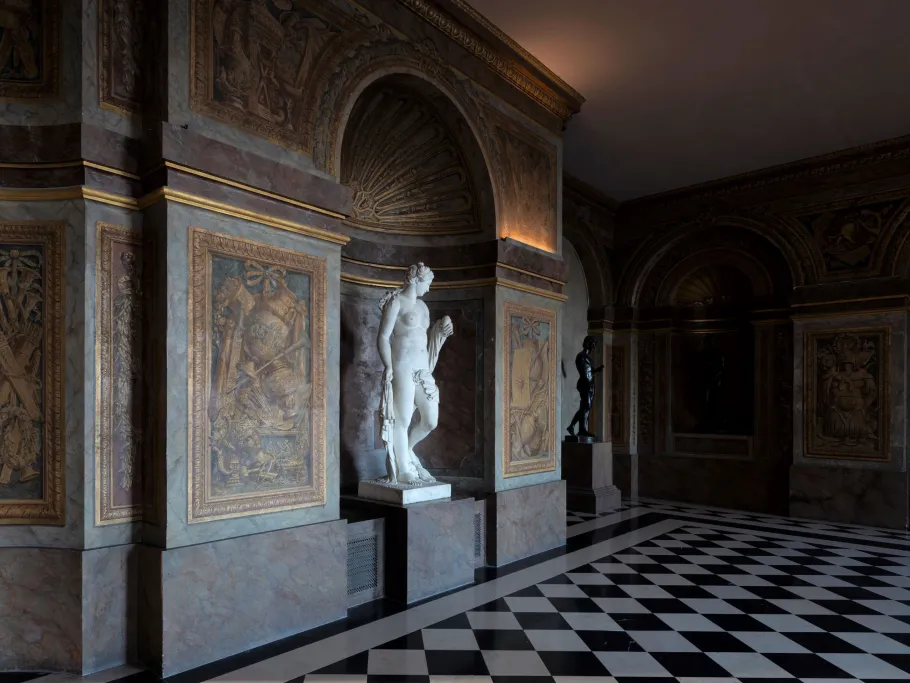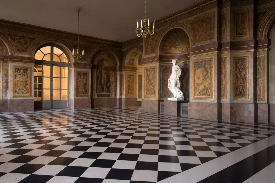 Située dans le corps central du Château, la salle des Hoquetons offre une vue sur le parterre du Nord. Entièrement recouverte de fresques, des statues à l’Antique représentant Amphitrite, Vénus et Adonis y sont exposées.