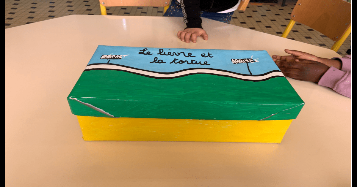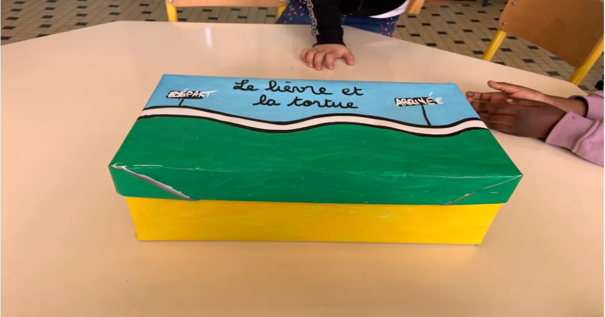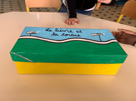 Boîte à histoire le lièvre et la tortue, une œuvre des CP de Mme Masbou-Duval - École Pierre Brossolette, Les Mureaux, Yvelines