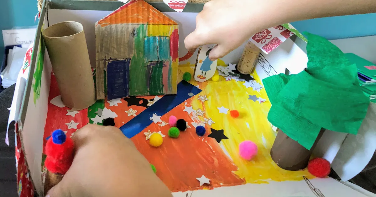 Après avoir étudié en classe trois fables de La Fontaine, les élèves ont décoré et aménagé une boite à chaussures qui s’ouvre comme une scène de théâtre. Ils ont créé des éléments de décor amovible et des personnages (cigale, fourmi, corbeau, renard…). Ils peuvent ainsi rejouer les Fables de manière théâtralisée, créer une nouvelle histoire en mélangeant les personnages et/ou en changeant les décors.
