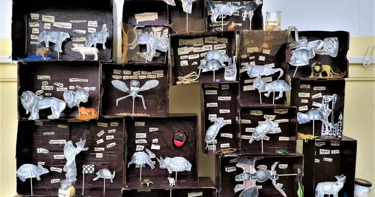 Lors de notre visite de l’exposition Les animaux du Roi, nous avons découvert la place importante des animaux dans les milieux artistiques et scientifiques à Versailles. Pour réaliser notre œuvre, nous avons sélectionné des fables et réalisé des collages pour mélanger les deux personnages. Nous avons également cherché ou fabriqué des éléments se rapportant aux différentes fables étudiées. Les animaux extraordinaires ont ensuite été disposés dans notre cabinet de curiosités où notre collection d’objets pourra continuer de grandir jusqu’à la fin de l’année scolaire, au fil de nos lectures.