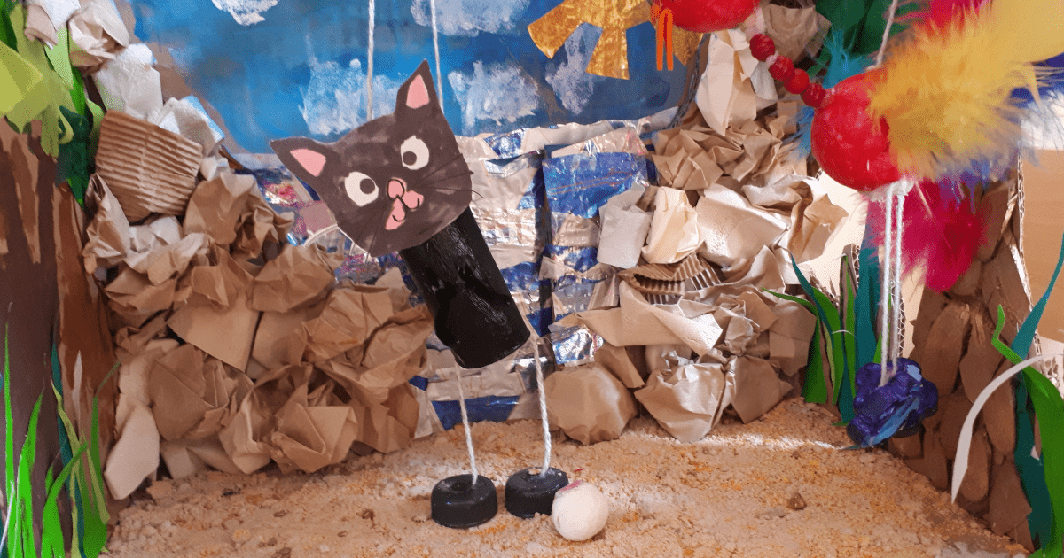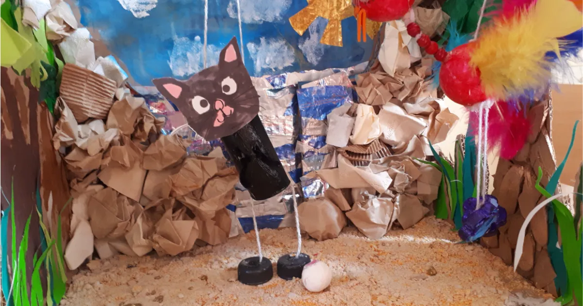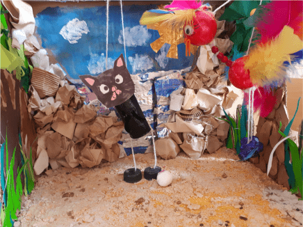 Après avoir étudié quelques fables de La Fontaine et avoir dégagé les principales caractéristiques de ces histoires les enfants ont inventé leur propre fable. Ils ont choisi deux animaux, le lieu de l’histoire et ont écrit un texte en dictée à l’adulte. C’est ensuite que les enfants ont réalisé de manière collective leur œuvre plastique.
