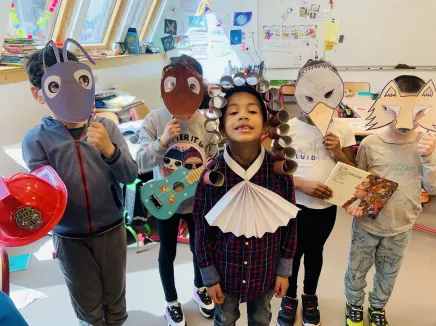 « On a decidé de faire une récitation devant toute la classe du corbeau et du renard et de la cigale et de la fourmi, de les mettre en scène et de les faire se rencontrer ! »