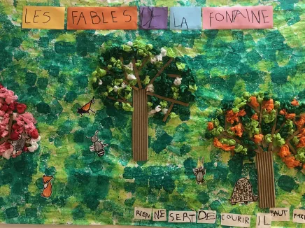 Lecture de plusieurs fables de la Fontaine. Un intérêt particulier a été porté sur trois fables, ce qui a amené la classe à la réalisation plastique d’un panneau commun les reflétant.