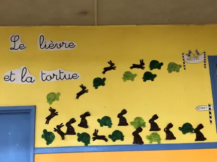 Réalisation d'une fresque collective représentant la fable Le lièvre et la tortue en utilisant différentes techniques :