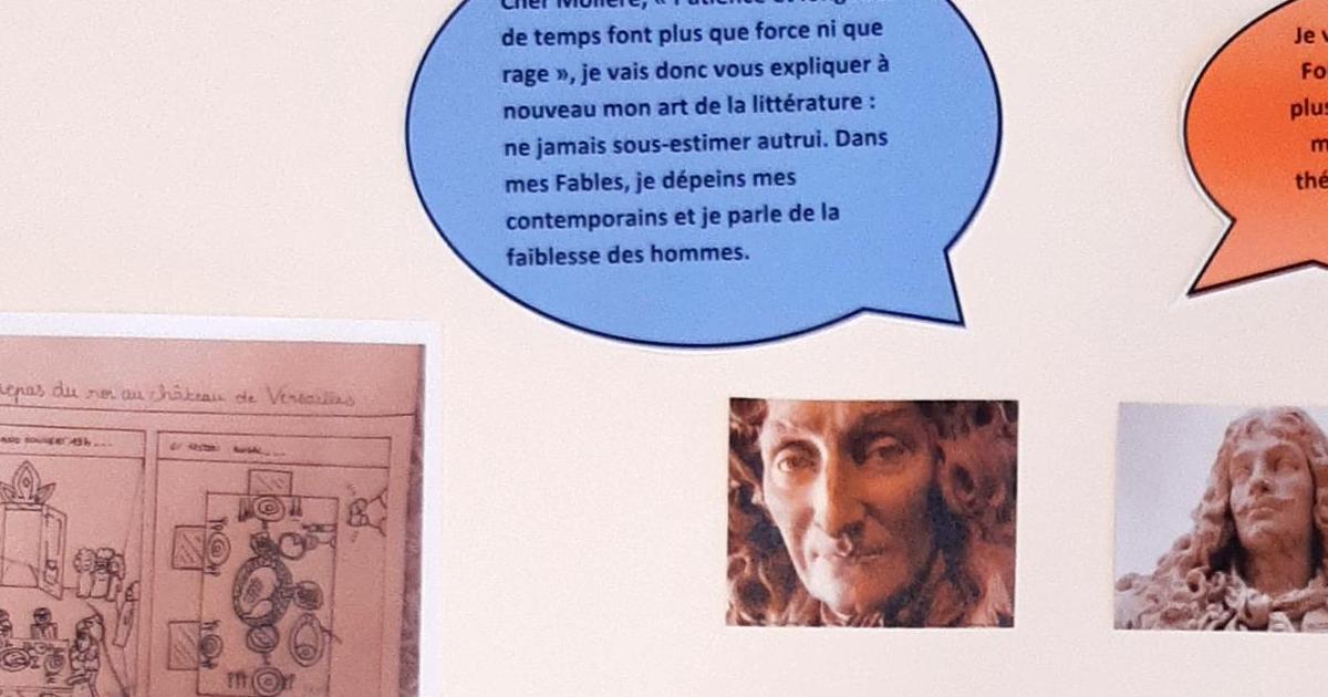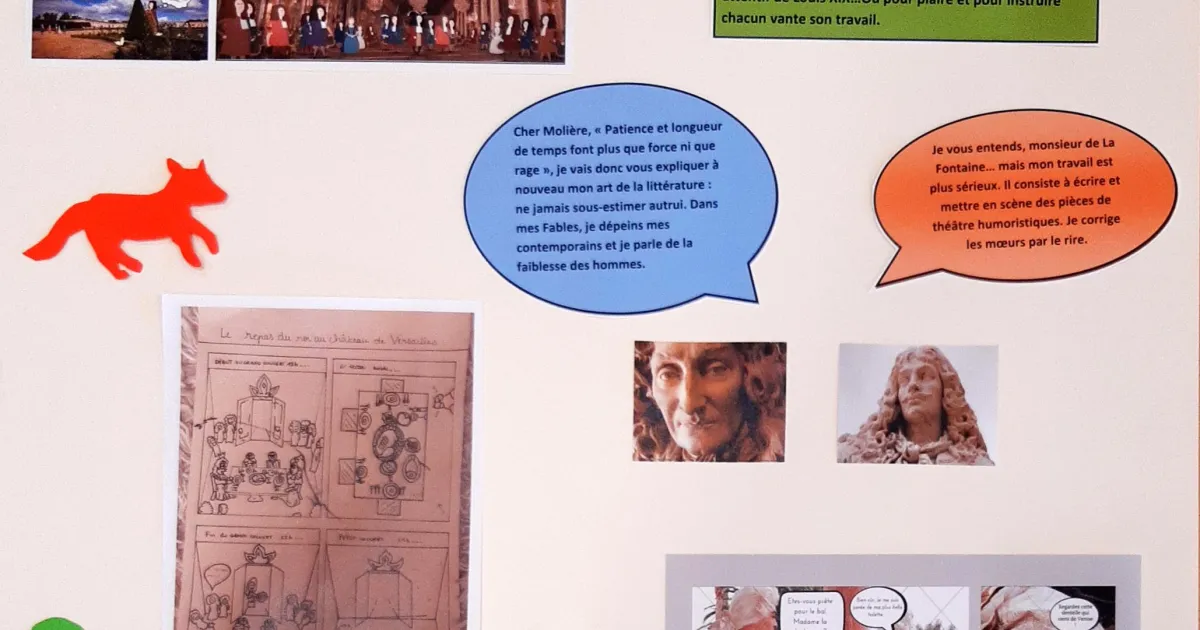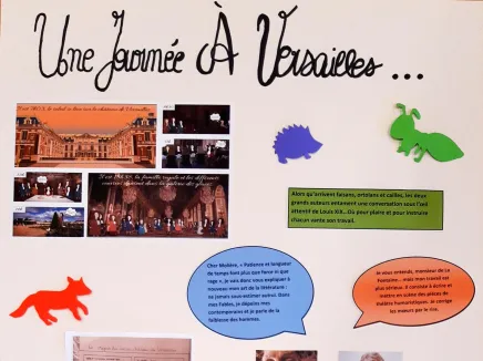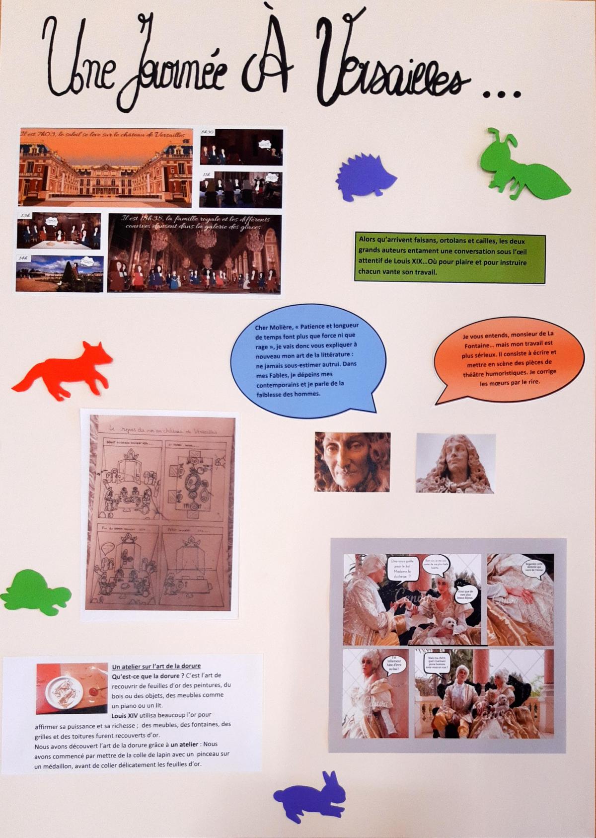 Nous avons passé une journée au château de Versailles: découverte d’endroits magnifiques comme la galerie des glaces, les appartements du roi, le théâtre et atelier sur l’art de la dorure. Nous avons choisi de présenter notre travail en faisant une affiche. Nous avons imaginé un repas où Molière et La Fontaine vantent leur art auprès du roi : plaire et faire rire, mais aussi éveiller les hommes en traitant de leurs défauts, des travers de la société du XVIIIème et livrer une morale.