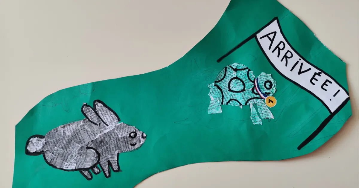 Dans un premier temps, les élèves ont choisi une fable par groupe. Ils ont ensuite retapé cette fable sur un logiciel de traitement de textes, imprimé et tamponné de peinture leur feuille. Ensuite, ils ont dessiné sur une grande feuille de couleur les contours des animaux de cette fable. Puis ils ont déchiré et collé le texte des fables afin de remplir les personnages dessinés. Pour finir, ils ont dessiné quelques détails sur les animaux et le décor avec un marqueur noir.