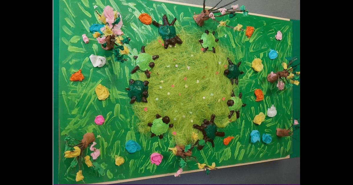 * Réalisation des panneaux : peinture de l’herbe avec de la peinture épaissie + acrylique, collage de fausse paille verte, collage de sable pour la piste et ajout de petites fleurs et papillons prédécoupés sur la paille centrale, fleurs en crépon coloré.