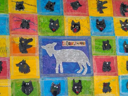L’intention artistique est de réaliser un bestiaire pour illustrer la fable « Le loup et l’agneau » de Jean de La Fontaine. L’agneau est doux et candide alors que les loups, en meute, ont la gueule ouverte et les crocs acérés, prêts à dévorer la pauvre bête.