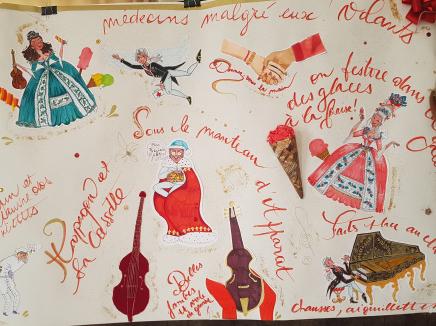 Les verts : le vert et l’argent, thème principal : jardins parlent, racines comme serpents du caducée, doucement s’enroulent autour des pieds…d’Hermès. La Fontaine s’anime et la Grenouille boit l’eau. L’ambiance est enjouée et merveilleuse, les ridicules font les précieuses…à vous de jouer de la magie sous la baguette de Lully !