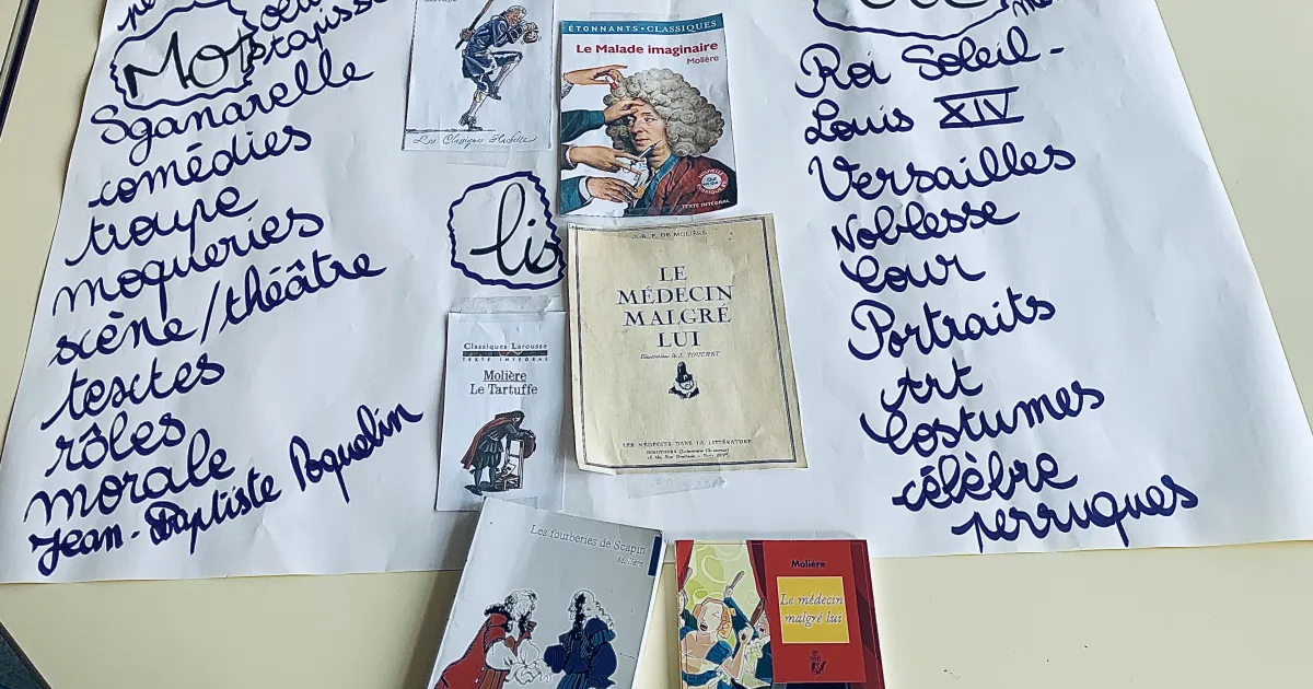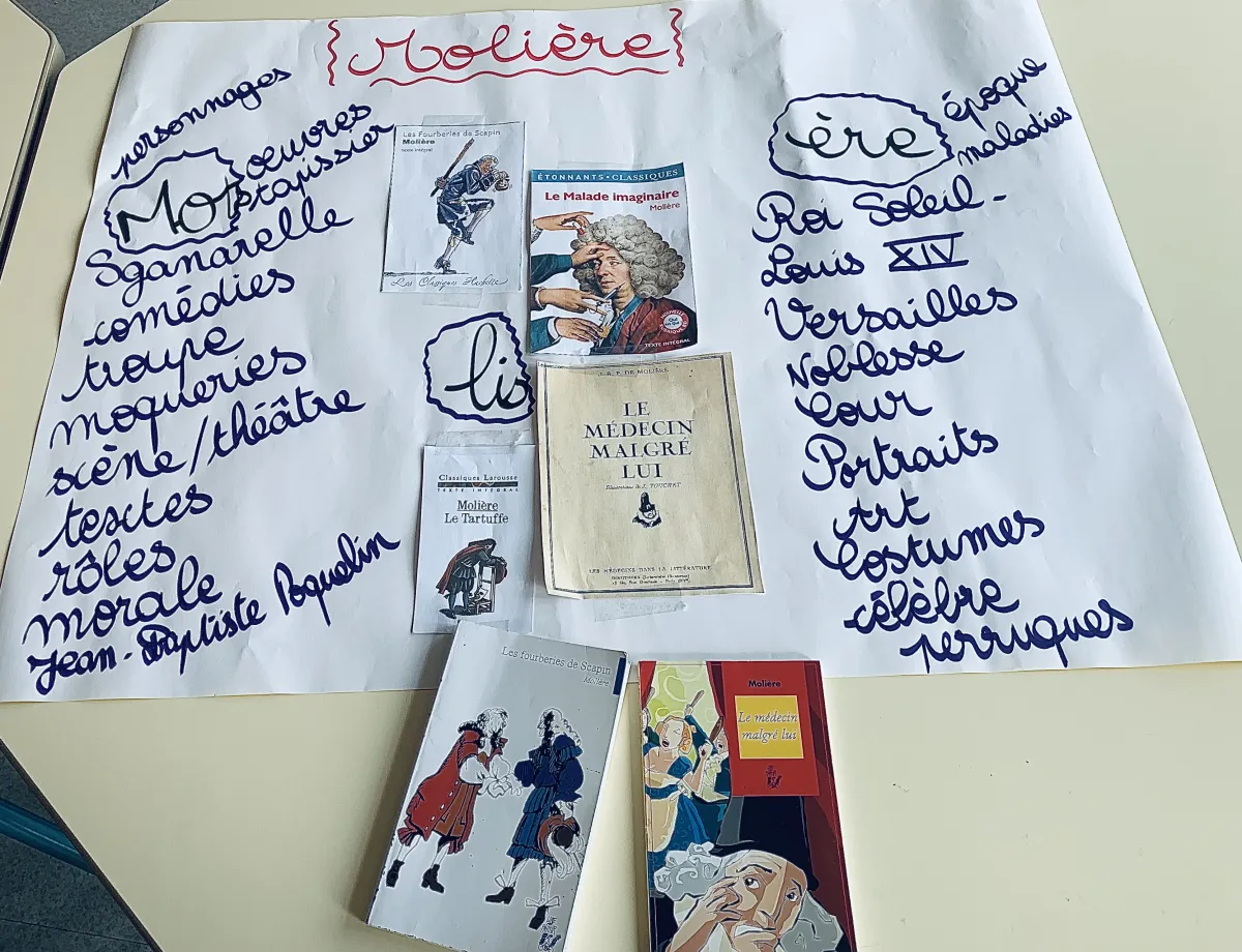 Les élèves sont donc partis sur la base du nom de scène MOLIERE en le découpant de manière à former un jeu de mots avec ce nom, ce qui donne « Mots » « Lis » « Ère ».