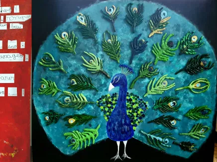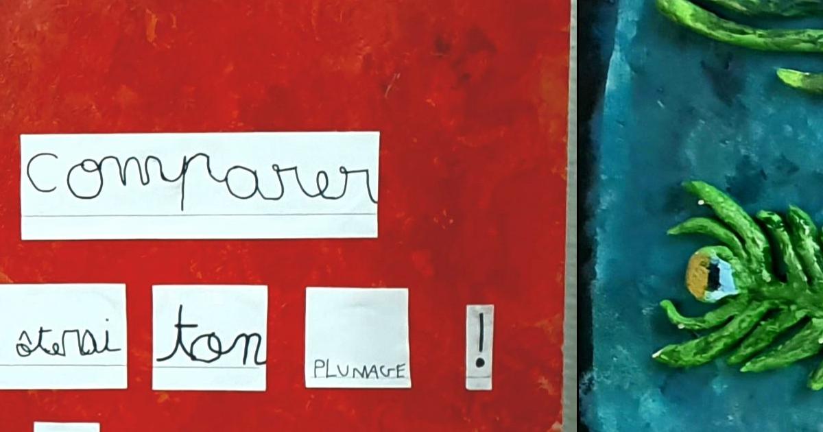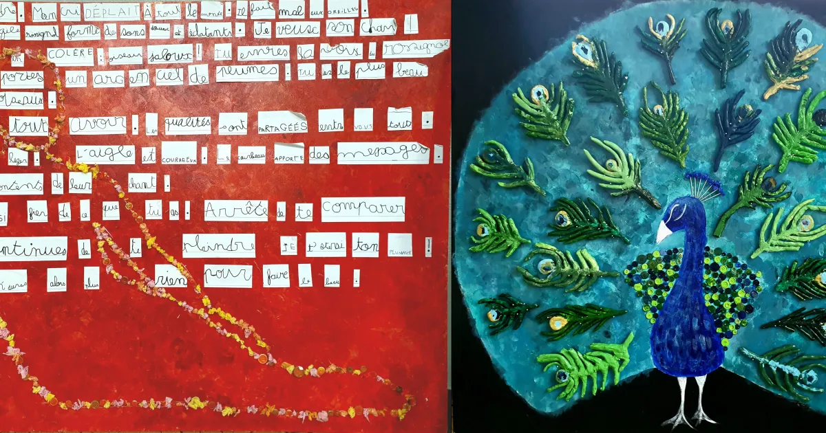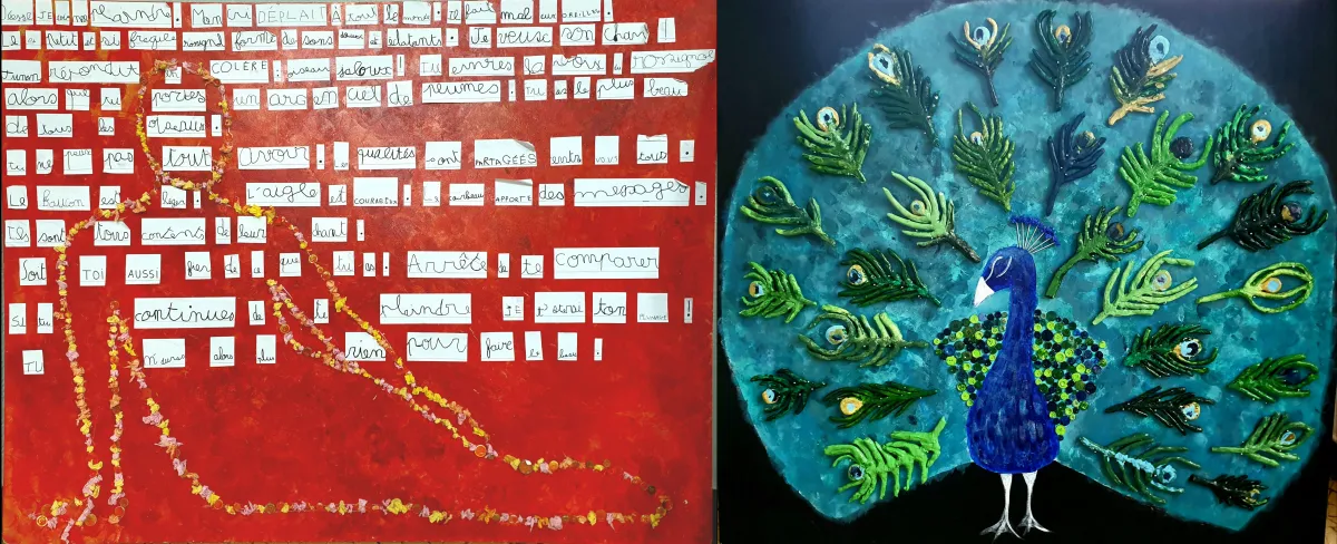 Après avoir étudié la fable, nous l’avons mis en scène avec des marottes pour mieux nous l’approprier. Nous avons représenté le paon et Junon avec de la peinture sur panneau en bois. Les plumes du paon sont réalisées en argile. Pour mieux comprendre les enjeux de la morale de la fable, nous avons réécrit le texte avec nos propres mots en l’affichant sur le panneau de la déesse Junon.