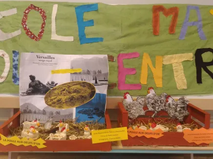 Nous avons visité les jardins et les différentes fontaines de Versailles. Nous avons observé les animaux présents. Ensuite, nous avons étudié la fable de La Fontaine : La poule aux œufs d’or. Nous avons travaillé le vocabulaire des différentes parties du corps, le cri, l’habitat et l’alimentation de cet animal. Nous avons lu différents documentaires et albums sur la poule. Nous avons modelé une poule en terre et 3 œufs puis nous les avons colorées avec de la peinture acrylique. Nous les avons disposées dans une cagette sur de la paille avec des graines. Nous avons entendu d’autres fables adaptées pour les enfants de maternelle. En motricité, nous avons marché lentement et appris à saluer comme à la cour du roi Louis XIV avec nos couronnes sur la tête bien sûr et en écoutant des musiques de l’époque. Nous allons, le jeudi 14 avril, vivre une visite virtuelle sur l’atelier : Le petit théâtre de Versailles. Nous allons essayer de faire des créations poétiques sur ce projet.