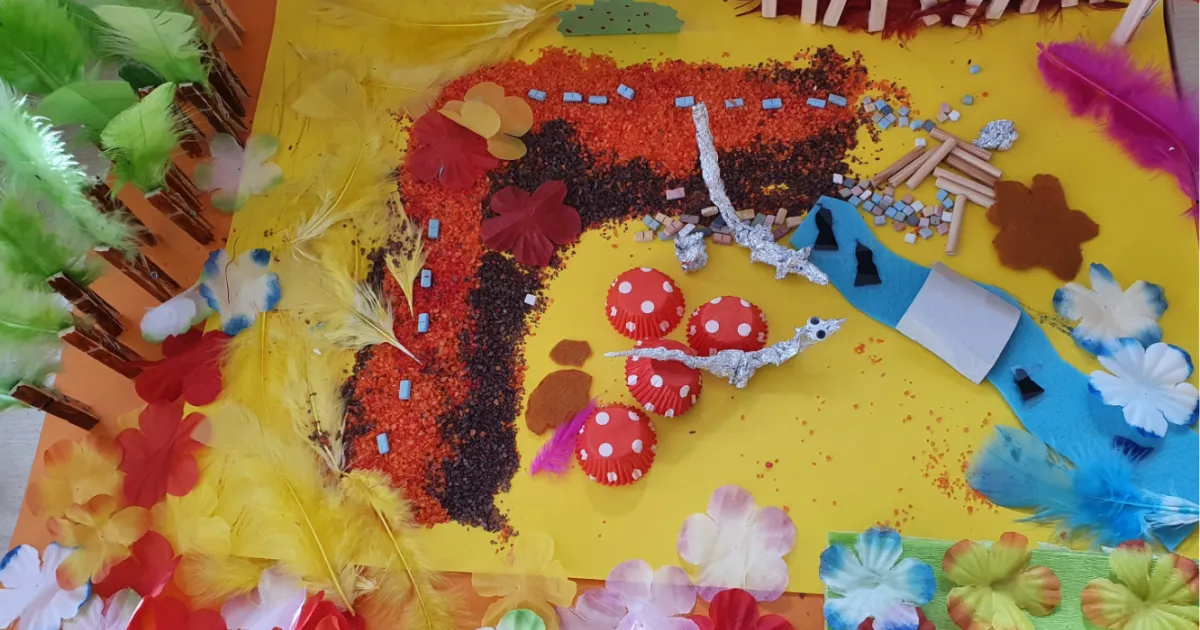Afin d'illustrer cette fable, les élèves ont cherché à reproduire l'environnement en assemblant divers éléments formant ainsi une vue d'ensemble sur tous les endroits énoncés par leur fable.