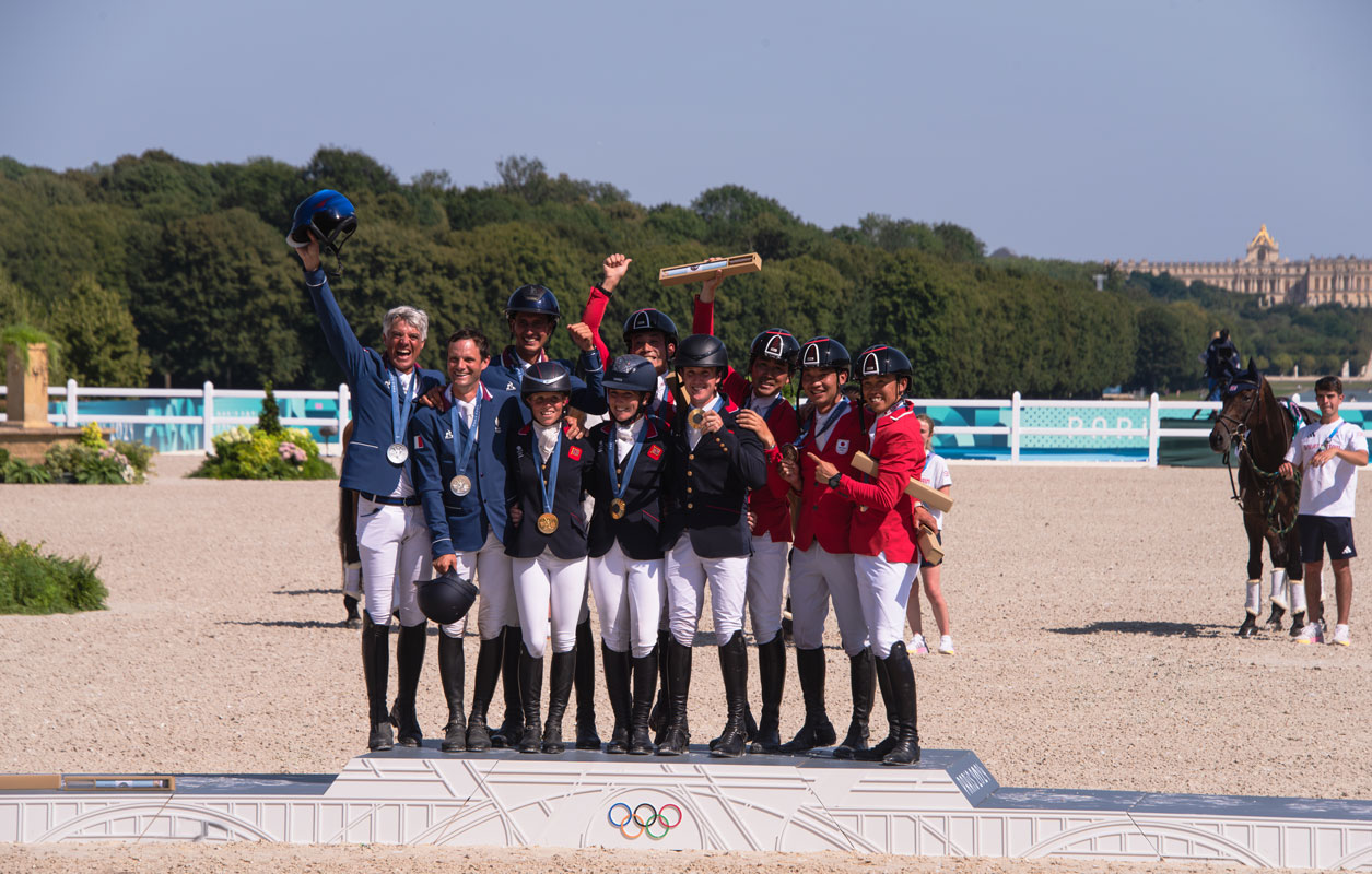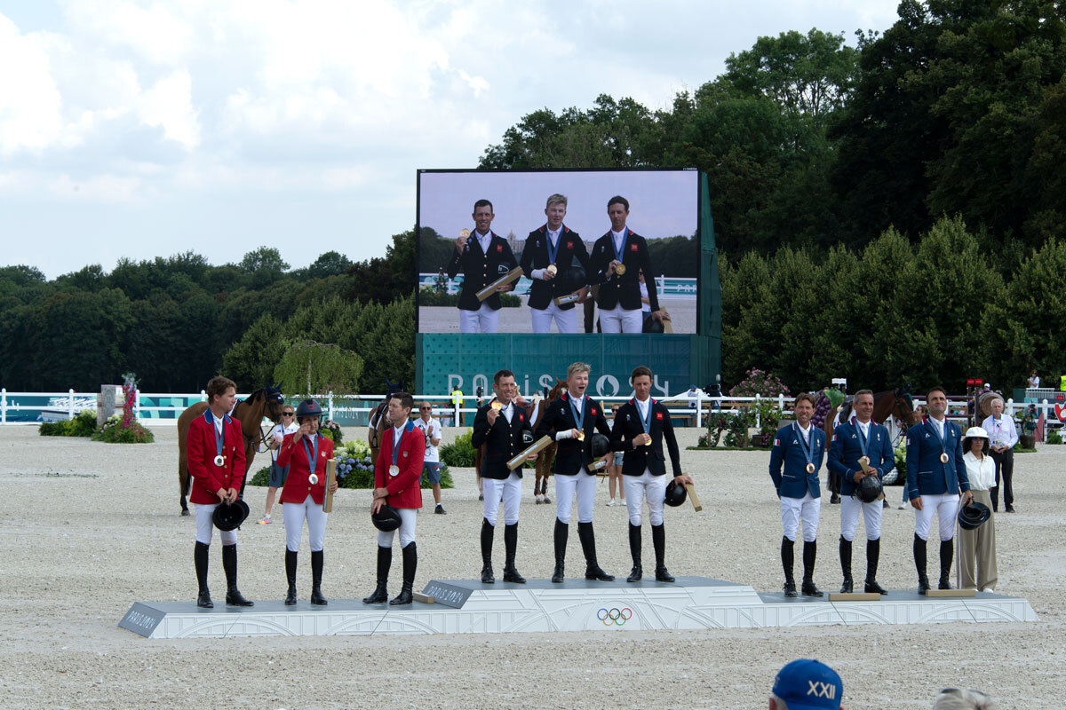 L'équipe de Grande-Bretagne médaillée d'or au CSO, celle des États-Unis médaillée d'argent et le trio français médaillé de bronze © Château de Versailles