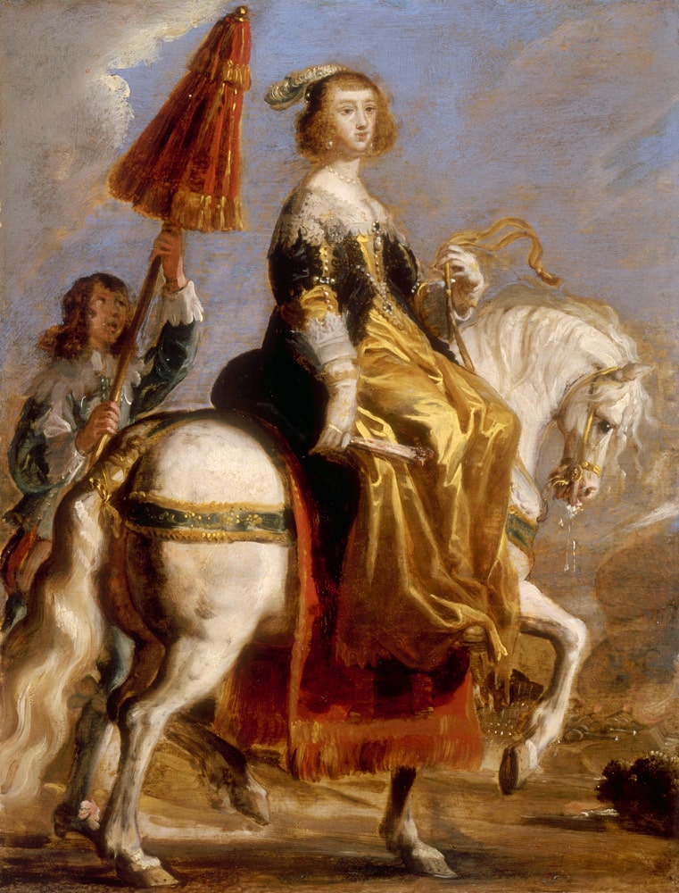 Dans ce portrait, la posture de la reine est audacieuse pour son époque. L’artiste a en effet choisi de la peindre à califourchon sur le cheval et portant un pantalon. A cette époque, le pantalon ne fait pas partie de la garde-robe féminine, encore moins celle de la reine de France.