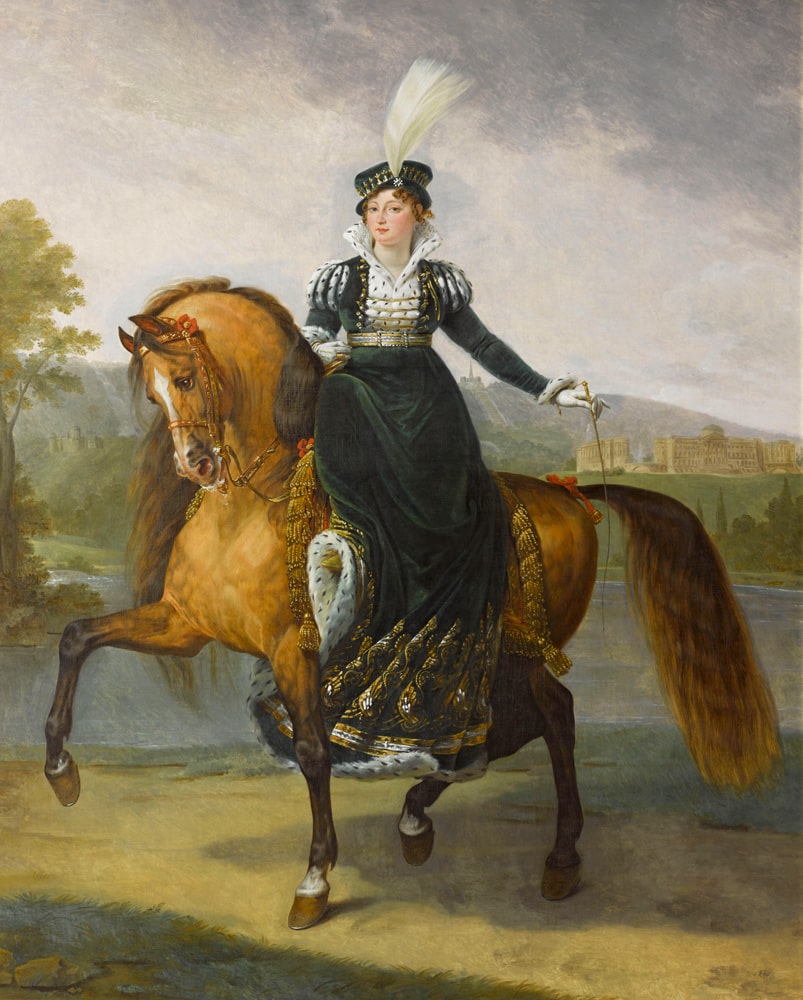 Ce portrait de Catherine de Wurtemberg a été peint par le baron Antoine-Jean Gros entre 1807 et 1835. Princesse russe, Catherine de Wurtemberg est aussi connue sous le nom de Catherine Bonaparte, puisqu'elle épouse, en 1807, Jérôme Bonaparte, roi de Westphalie, frère de Napoléon Ier. La reine est peinte à cheval devant une vue du château et des jardins de Wilhemshöhe, rebaptisé alors Napoleonshöhe, aux portes de Kassel.