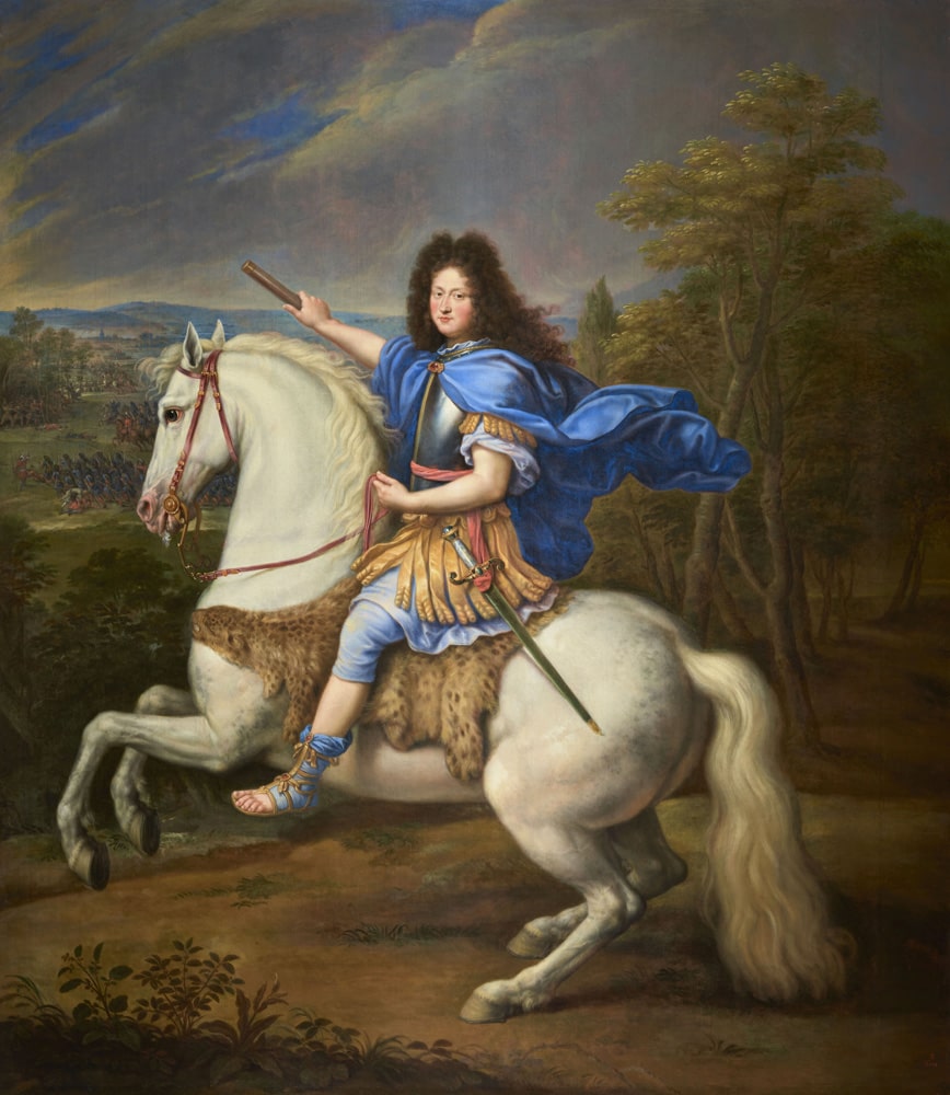 Commandé par les Bâtiments du roi à un jeune artiste, élève de Charles Le Brun, ce tableau de Louis XIV répond à un genre traditionnel extrêmement codifié du portrait équestre. Le roi, figuré en chef de guerre et devant le siège d’une ville à l’arrière-plan, tient le bâton de commandement, signe de son autorité. Il monte un cheval blanc, cabré, symbole de la victoire. L’animal représenté de trois-quarts et non de profil, créant un effet dynamique, est équipé de riches étriers et d’un harnachement rehaussé de pierres précieuses et de diamants, témoignant de la richesse et du pouvoir du cavalier. Sa fougue, très mesurée, et son allure superbe témoignent également de la parfaite maîtrise de l’art équestre par le souverain.