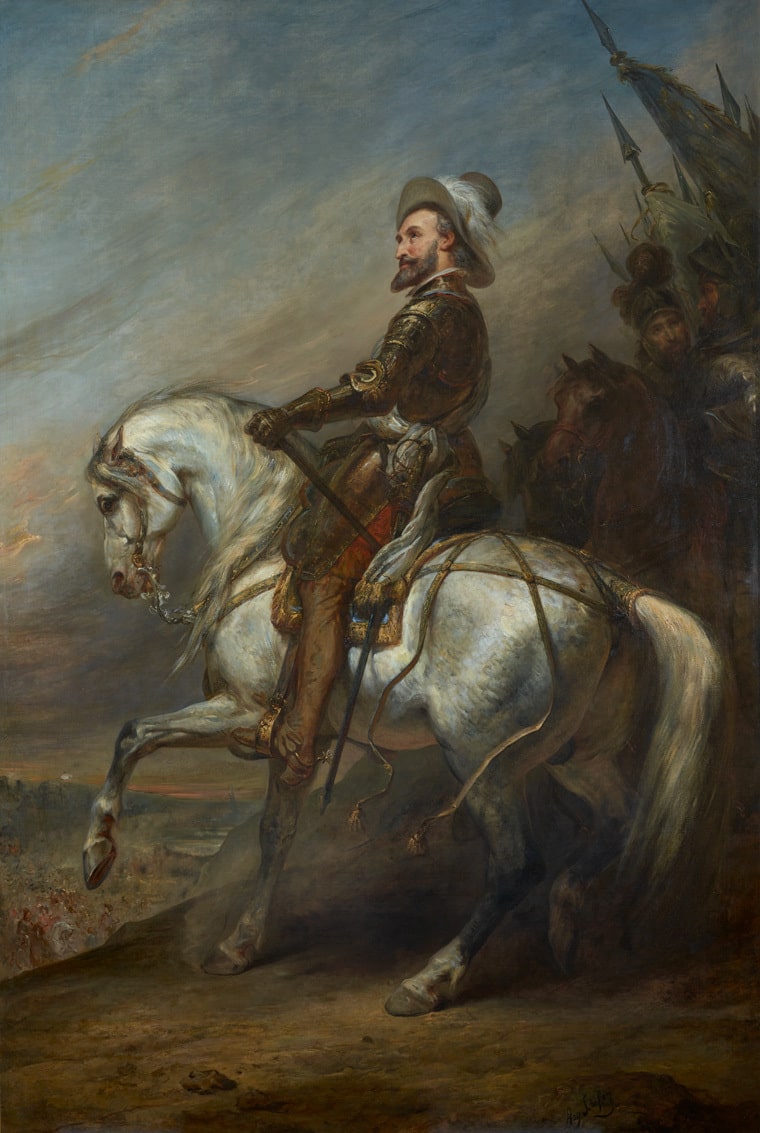 Le roi Charles X (1757-1836) commanda à Ary Scheffer ce portrait équestre d’Henri IV en novembre 1828 pour le grand appartement du palais des Tuileries. Dans le cabinet du Roi, il venait ainsi compléter une série de peintures à la gloire des Bourbons. Beaucoup représenté dans les dernières décennies de l'Ancien Régime, Henri IV le fut davantage encore sous la Restauration : fondateur de la dernière dynastie royale, ayant conquis son trône à cheval et à la pointe de l'épée, il devint l'une des figures les plus populaires de l'histoire nationale. Sur cette toile envoyée à Versailles pour le décor des Galeries historiques, Louis-Philippe fit ajouter à l'insu de Scheffer le chapeau dont est coiffé Henri IV, considérant qu'il n'était pas convenable que son aïeul fût représenté tête nue sur le champ de bataille.
