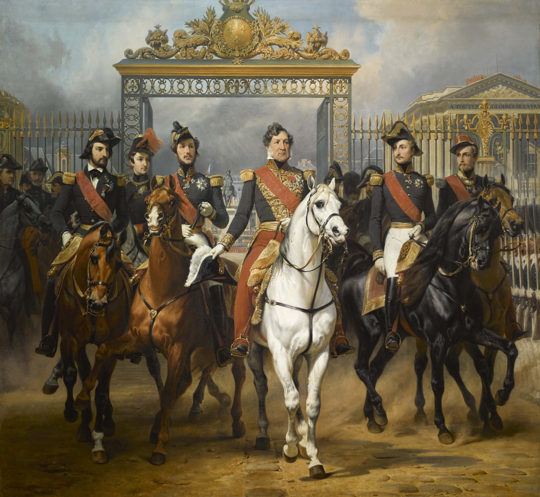 Le roi Louis-Philippe et ses fils sont à cheval devant la grille royale du château de Versailles, avec à l'arrière-plan, la statue équestre de leur aïeul, Louis XIV. Les princes sont disposés de manière protocolaire autour de leur père. A sa droite : Ferdinand-Philippe, duc d'Orléans et Prince Royal (pourtant décédé depuis 1842) ; François, prince de Joinville ; Antoine, duc de Montpensier en léger retrait. A sa gauche, Louis, duc de Nemours, et Henri, duc d'Aumale. Tous sont en tenues d'officiers généraux.