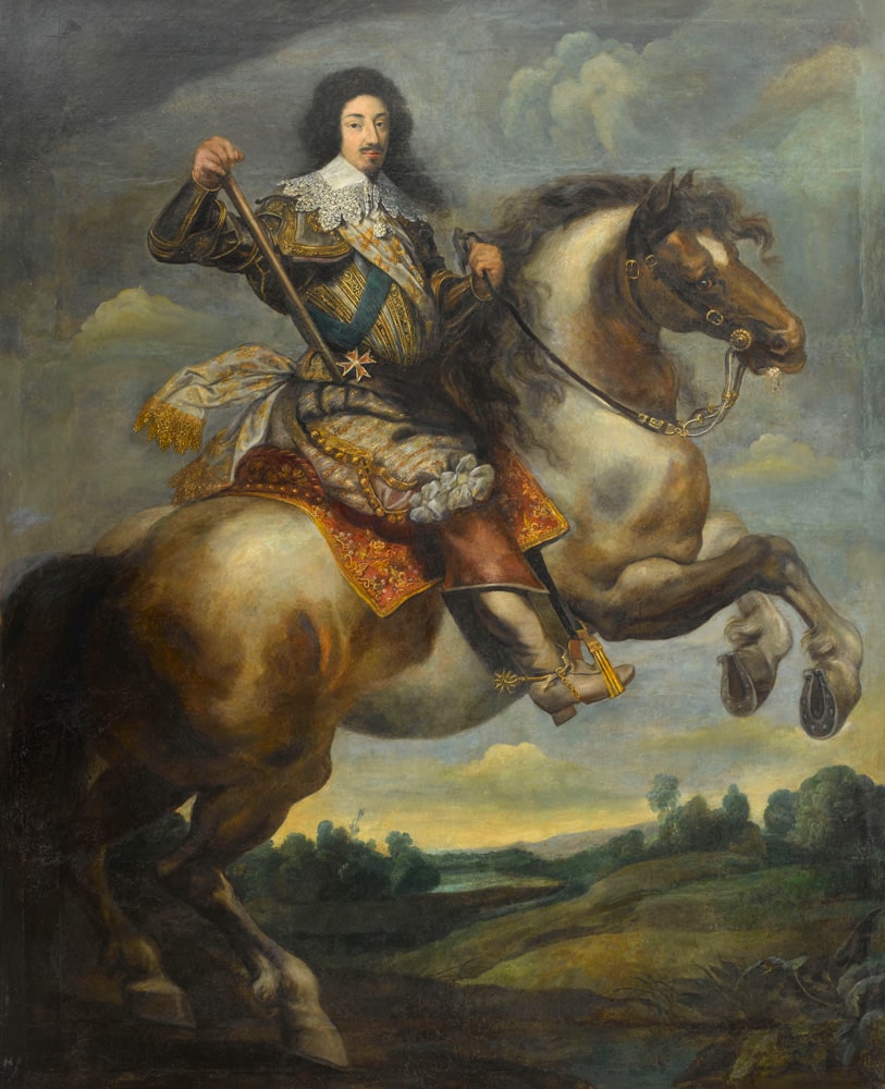 Cette peinture a été réalisée par Claude Deruet, entre 1630 et 1643. L’artiste représente le roi Louis XIII sur un cheval cabré, avec le bâton de commandement à la main et portant un ruban bleu de l’Ordre du Saint-Esprit. Le souverain se détache du paysage attestant de son emprise sur son royaume. Grand cavalier et chasseur, Louis XIII est à l’origine du pavillon de chasse de Versailles qui deviendra par la volonté de Louis XIV et de ses successeurs, le château actuel.
