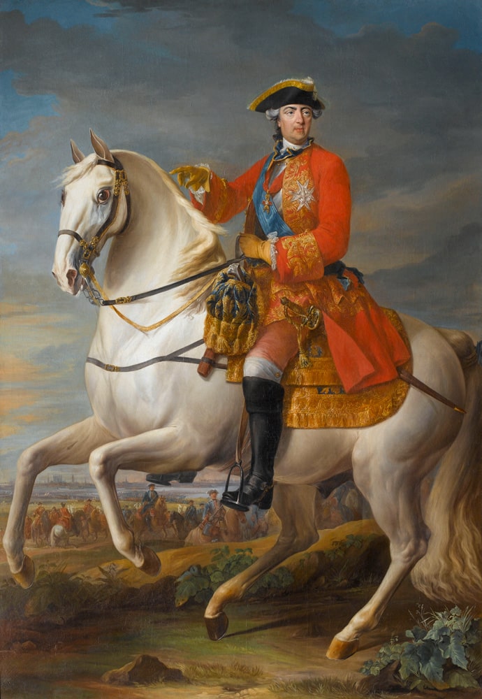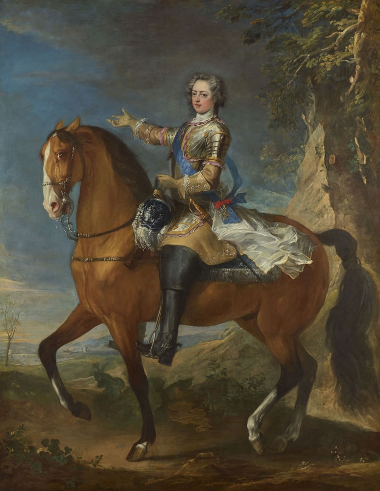 En 1723, le duc d'Antin commande à Charles Parrocel un portrait de Louis XV à cheval. Le peintre – engagé en 1705 dans la cavalerie – a développé un goût et un talent certains pour la peinture de sujets militaires et de chevaux. Néanmoins, ne se croyant pas assez exercé à la peinture des portraits, il s'associe à Jean-Baptiste Van Loo, célèbre peintre d'histoire qui, s'étant adonné au portrait, a le talent de saisir la ressemblance de Louis XV.