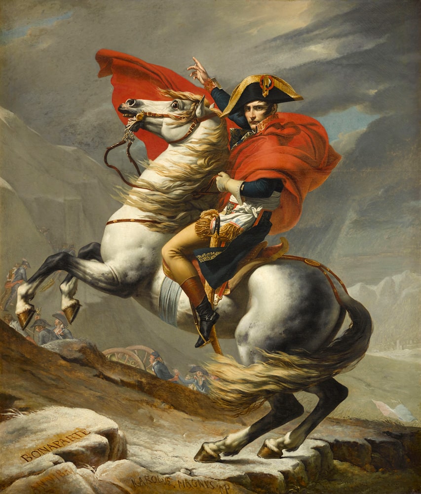 Ce célèbre portrait de David, commandé au retour de la seconde campagne d’Italie, est sans doute l’image la plus emblématique de Napoléon Ier (1769-1821) sous les traits du chef de guerre. Le modèle avait demandé au peintre de le représenter « calme sur un cheval fougueux » et le peintre y parvint d’une manière magistrale. Les chevaux sont à jamais associés à la légende de Napoléon Bonaparte. Dans cette image héroïque, la monture et son cavalier ouvrent une ère nouvelle en franchissant un col des Alpes, rejoignant les grands héros du passé. En effet, avant lui, Hannibal et Charlemagne avaient suivi le même chemin. Comme un écho, leurs noms illustres sont gravés dans la masse rocheuse enneigée.
