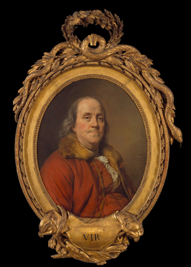 Ce portrait réalisé en 1778 par Joseph Siffred Duplessis - un des peintres favoris de la Cour - témoigne de la forte impression que fait Benjamin Franklin à Versailles. On y découvre un homme sans apprêt, aux habits simples. Mais il ne faut pas se laisser tromper, car c’est dans un cadre chargé de symboles que s’exprime l’importance du personnage : couronne de lauriers, serpent à sonnette, bonnet de la liberté, peau de lion et la mention VIR – homme en latin - sont autant d’indices sur la stature de Franklin.