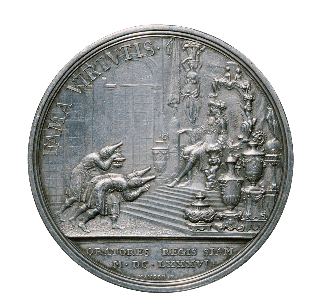 Cette gravure représente la procession des ambassadeurs du Siam arrivant au château de Versailles le 1er septembre 1686. Devant les ambassadeurs se trouve le baldaquin qui contenait la lettre d'or envoyée par le roi du Siam (Thaïlande) à Louis XIV. Le plus âgé des ambassadeurs siamois connaissait bien la cour de l'empereur chinois Kangxi et à ce titre, son roi, Phra Naraï (1633-1688), lui avait confié la tâche de mener une comparaison entre les cours chinoise et française.