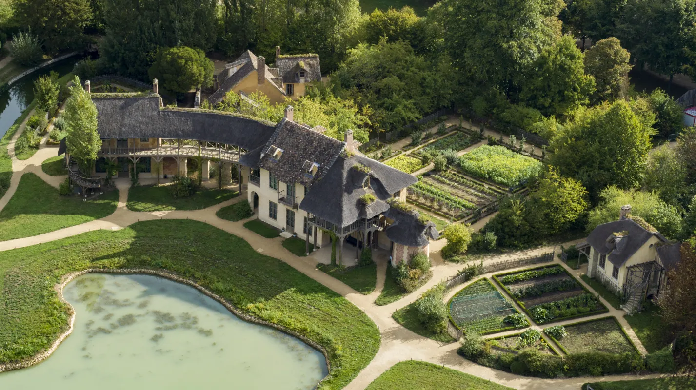 Au fond du domaine, le long des rives du lac, se dressent les chaumières du Hameau construit par Richard Mique pour Marie-Antoinette. Survivantes d'une époque brillante et mouvementée, elles illustrent le goût de la Reine pour le charme de la vie champêtre. Certaines maisons étaient consacrées à l'exploitation agricole, d'autres réservées aux plaisirs de la promenade et des réceptions. Leur intérieur révèle un décor raffiné qui contraste avec leur aspect rustique. À redécouvrir grâce aux travaux de restauration.