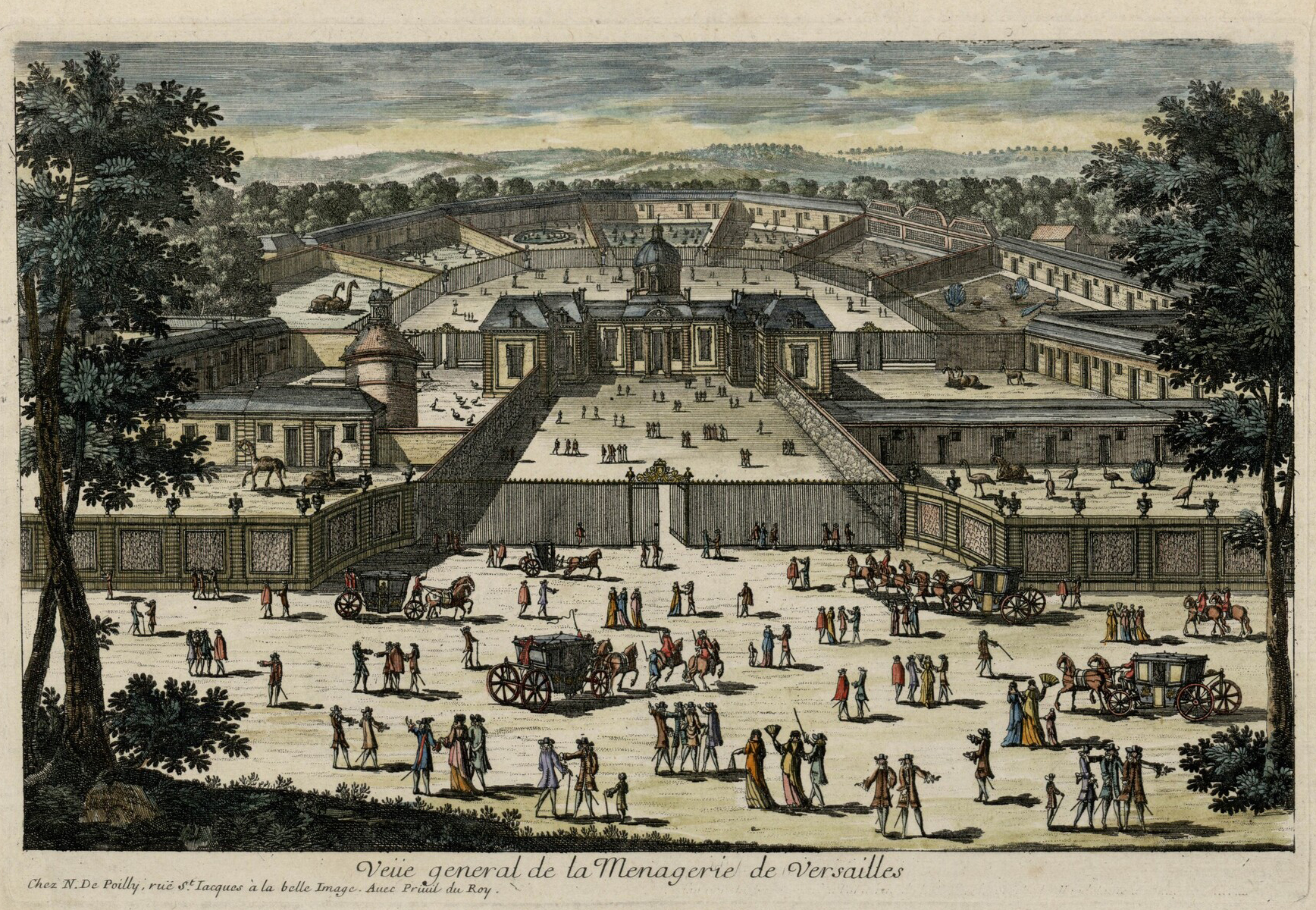 Souhaitée par Louis XIV et construite par son architecte, Louis Le Vau dès 1663, la Ménagerie royale de Versailles accueille un grand nombre d'animaux exotiques, dispersés dans des enclos, et disposés autour d'une tour permettant une vue panoramique. Depuis l'Antiquité, en effet, la tradition s'était solidement établie d'entretenir, non loin du souverain, des collections d'animaux exotiques, paisibles ou féroces.