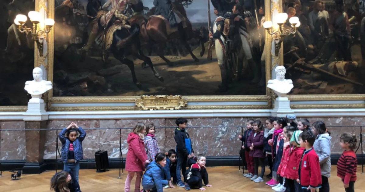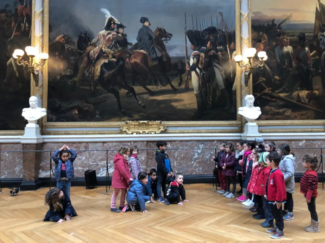 Suite à la visite guidée de la galerie des Batailles fin février, nous avons étudié les détails et les personnages de « La bataille d'Iéna » et de « La bataille de Lens ». Chaque enfant a essayé de reconstituer un des personnages du tableau chez lui, pendant le confinement, en reproduisant les costumes, l'attitude et les émotions. Un tableau collectif a été produit sur place, reproduisant l'ambiance de la bataille historique !