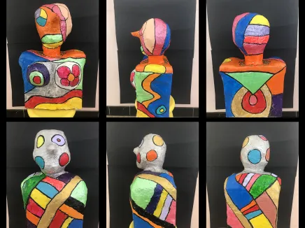 Après avoir observé les bustes de la galerie, les élèves ont eu l'idée de mettre de la couleur sur ces personnages afin de les rendre plus joyeux.