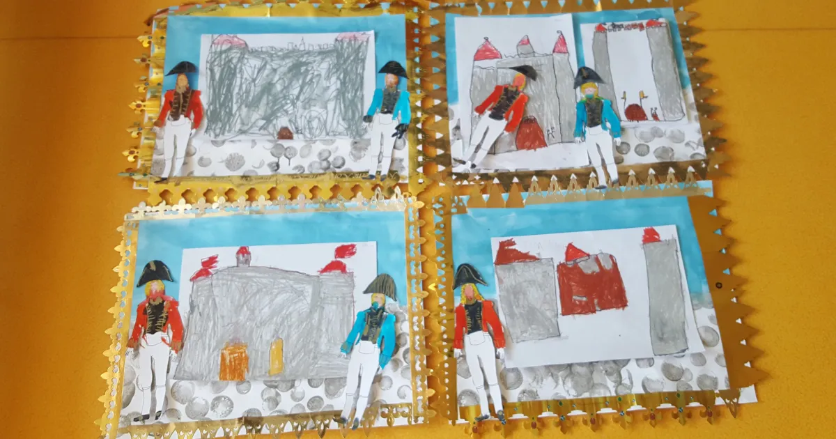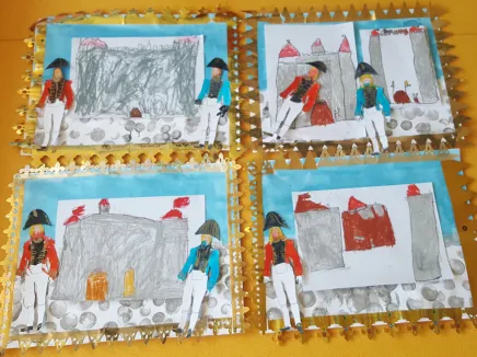 Nous sommes partis des bustes de Généraux présents dans la galerie des Batailles. Chaque enfant a choisi une photo noir et blanc d'un buste, l'a coloré avec de l'encre puis l'a prolongé avec un corps (tenue de Général), dessiné par mes soins. Ils ont colorié les corps à la craie grasse et ont décoré les tenues au marqueur doré. Les personnages ont ensuite été assemblés puis déposés sur un paysage réalisé collectivement rappelant les tableaux vus dans la galerie des Batailles. Enfin, un cadre doré à été réalisé.