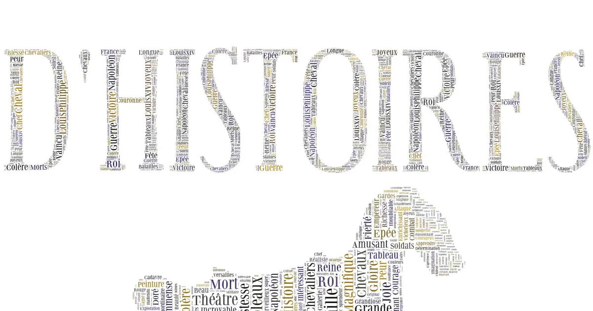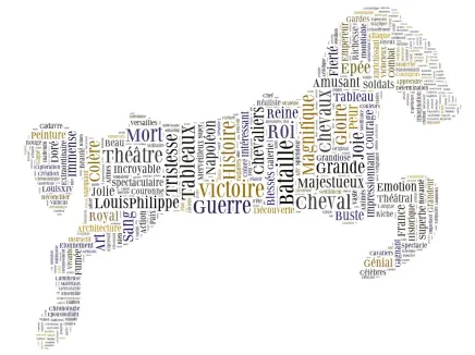 Ce visuel est le résultat du recensement de l’ensemble des mots proposés par les élèves à l’issue de leur visite de la galerie des Batailles. Il reflète leurs ressentis et leurs impressions de ce lieu emblématique du château de Versailles.